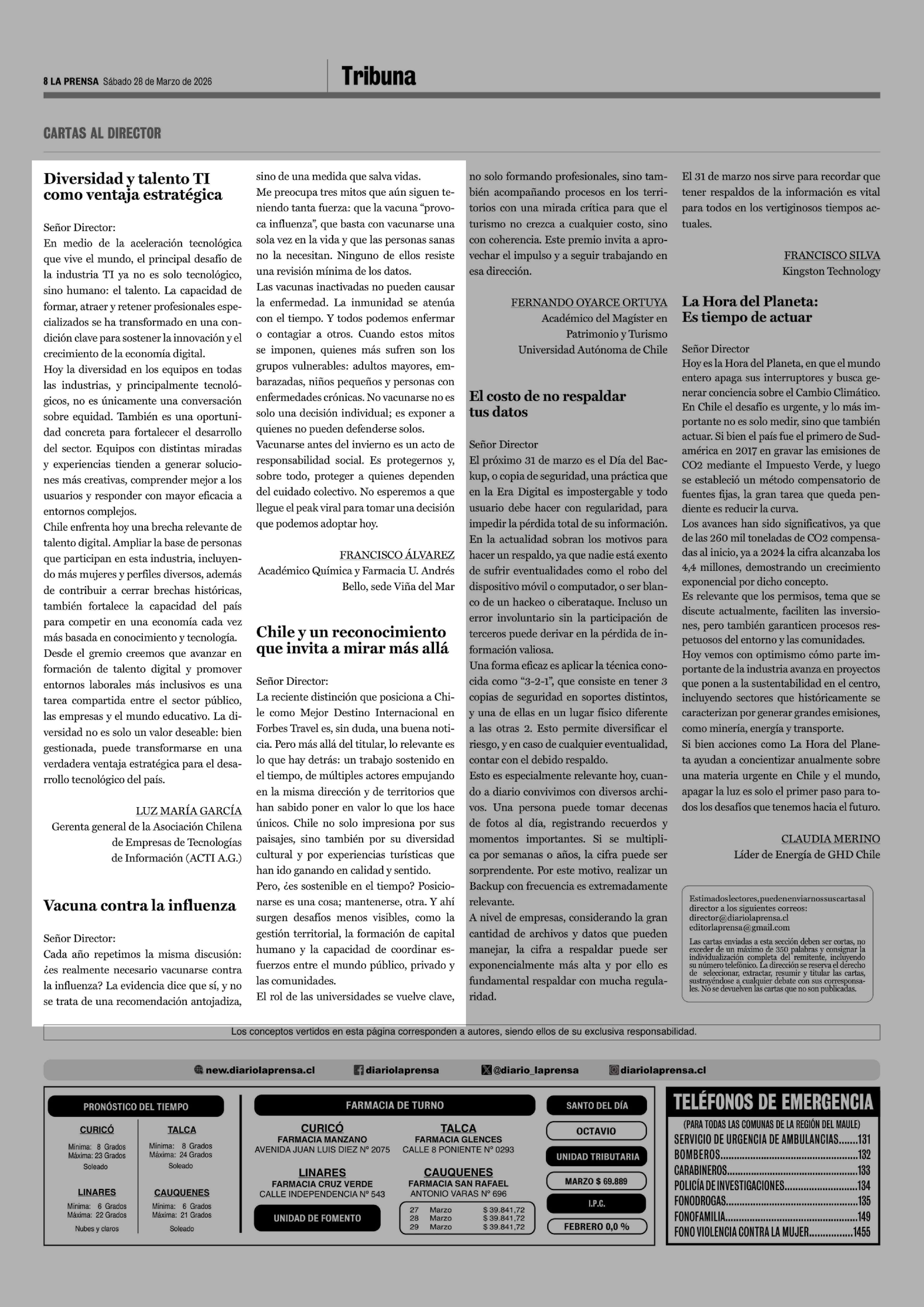 Cartas: Vacuna contra la influenza 28-03-2026 La Prensa de Curicó |