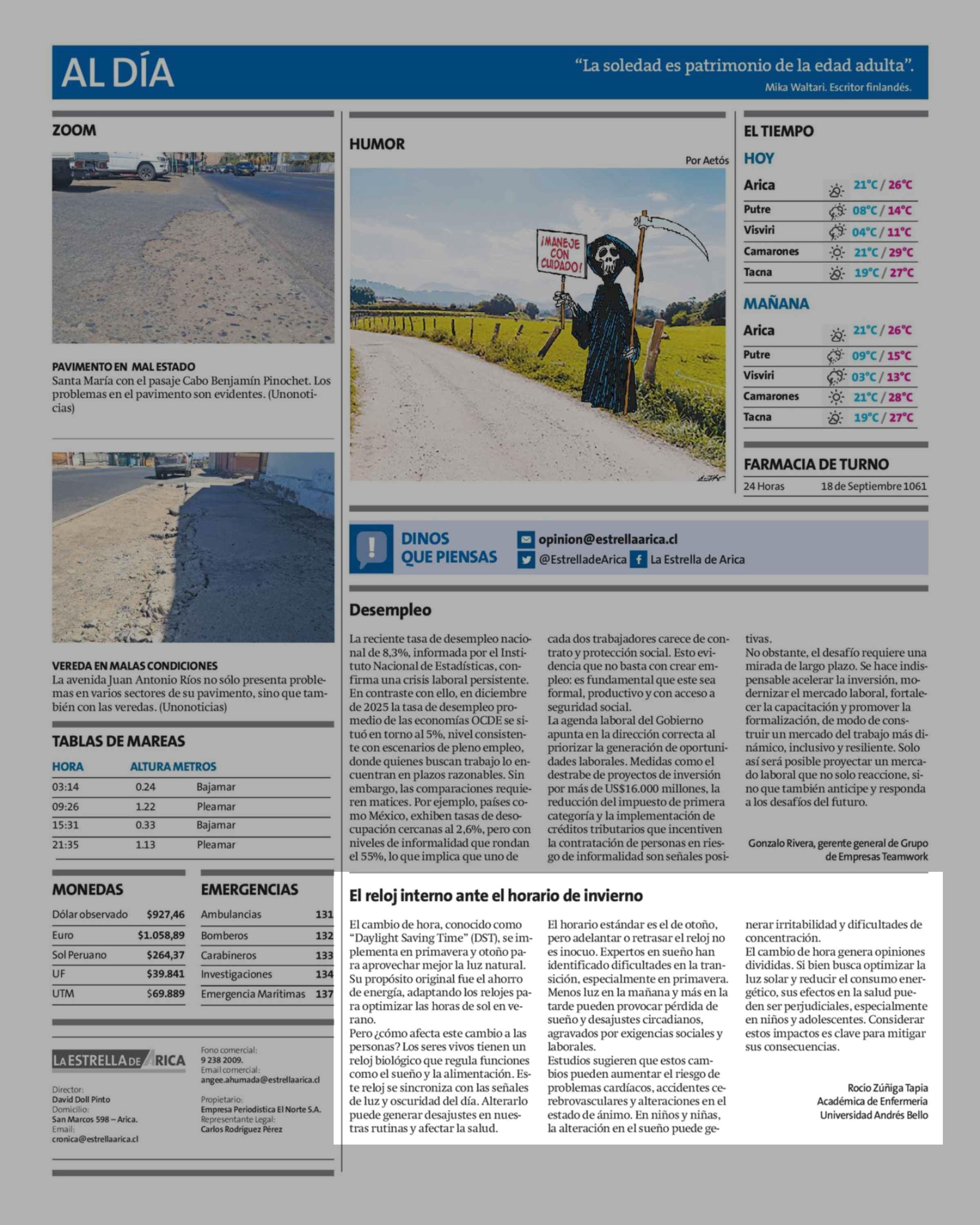 Cartas: El reloj interno ante el horario de invierno 02-04-2026 La Estrella de Arica |