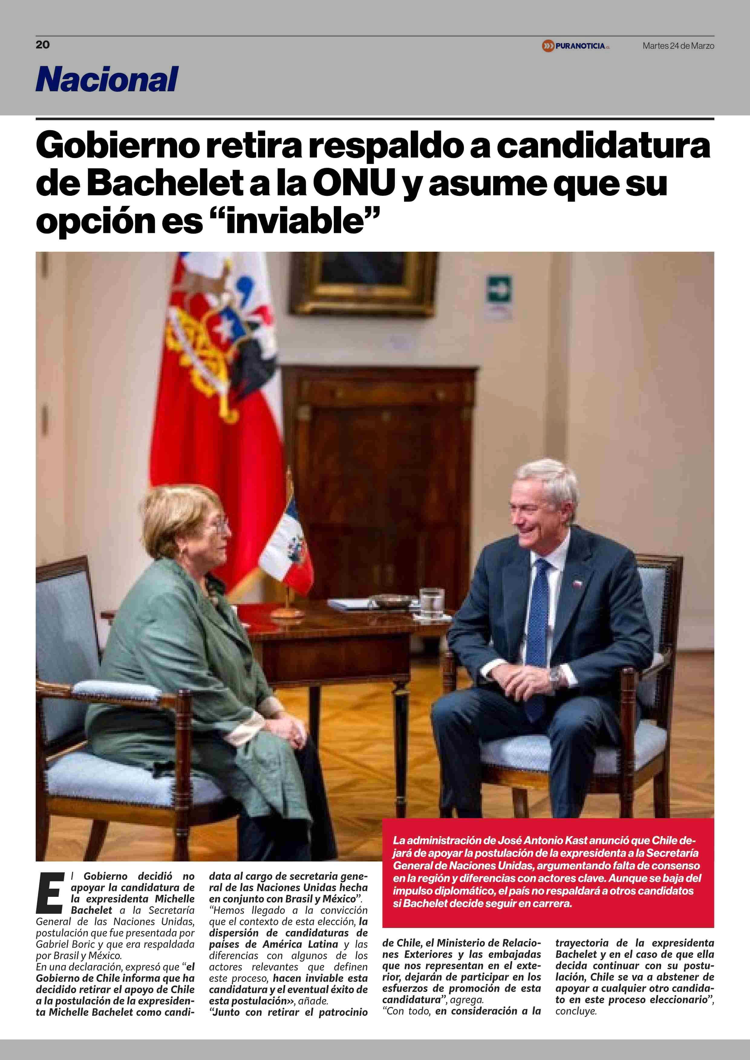 Gobierno retira respaldo a candidatura de Bachelet a la ONU y asume que su opción es “inviable” 24-03-2026 Puranoticia.cl |