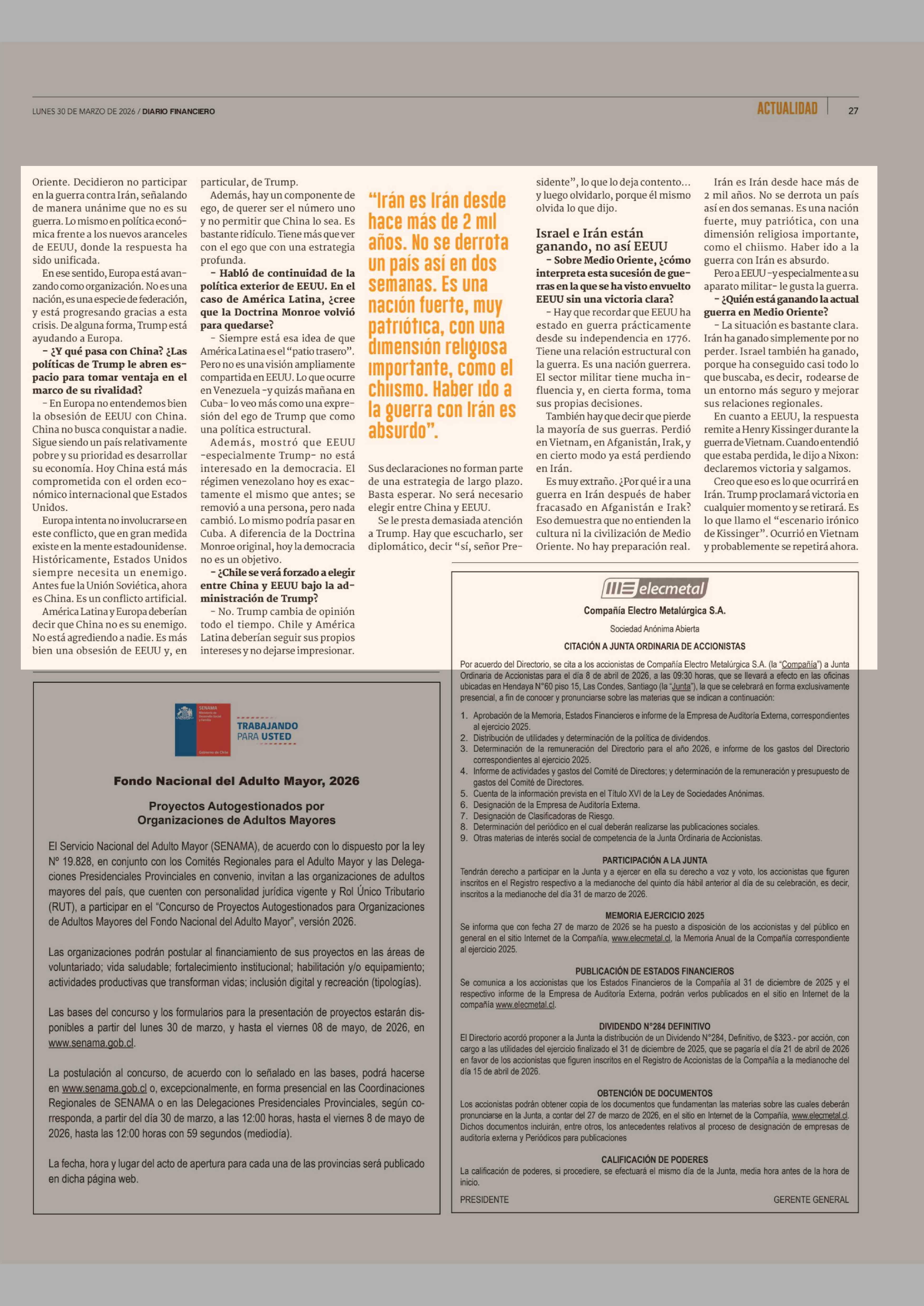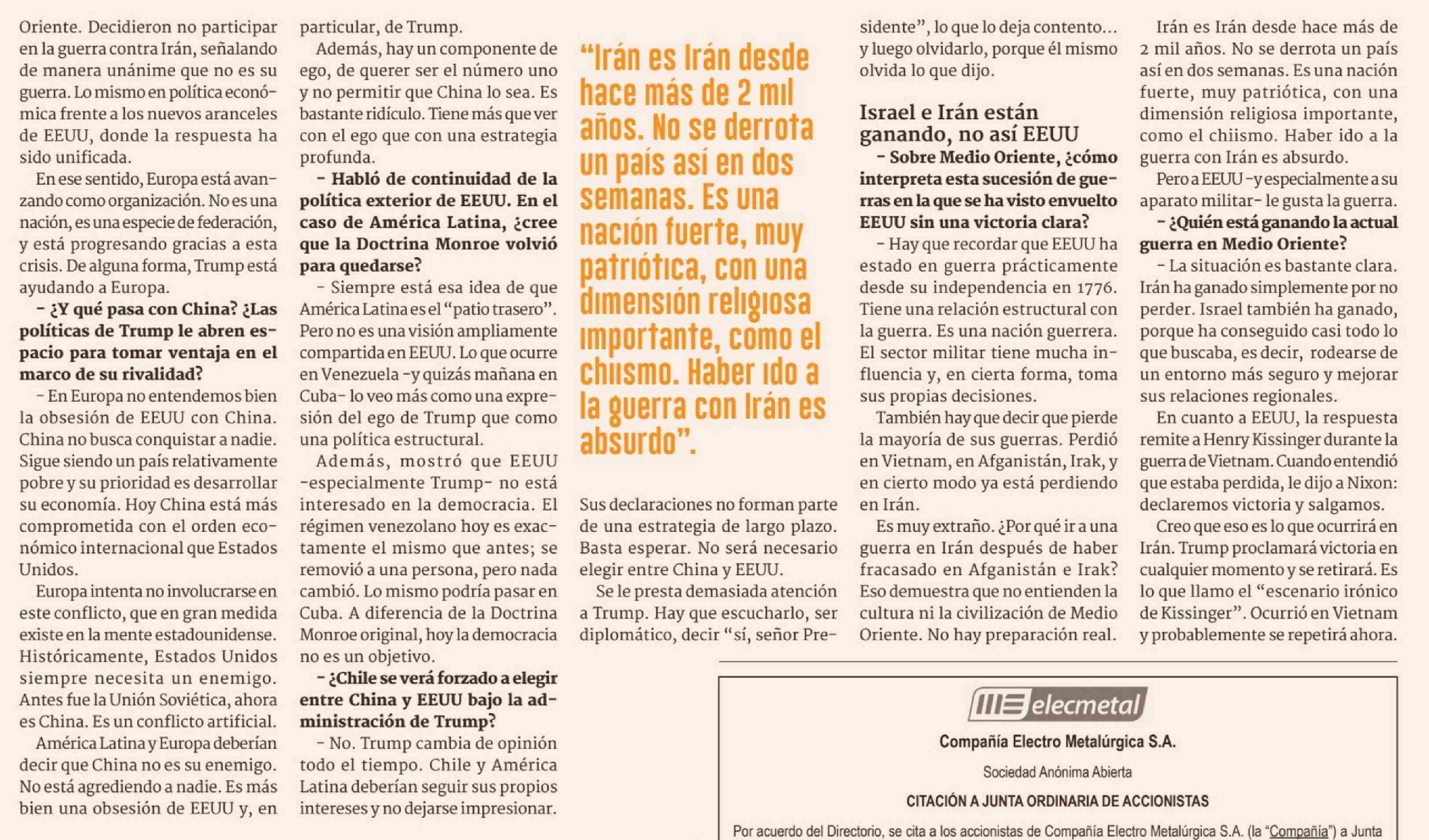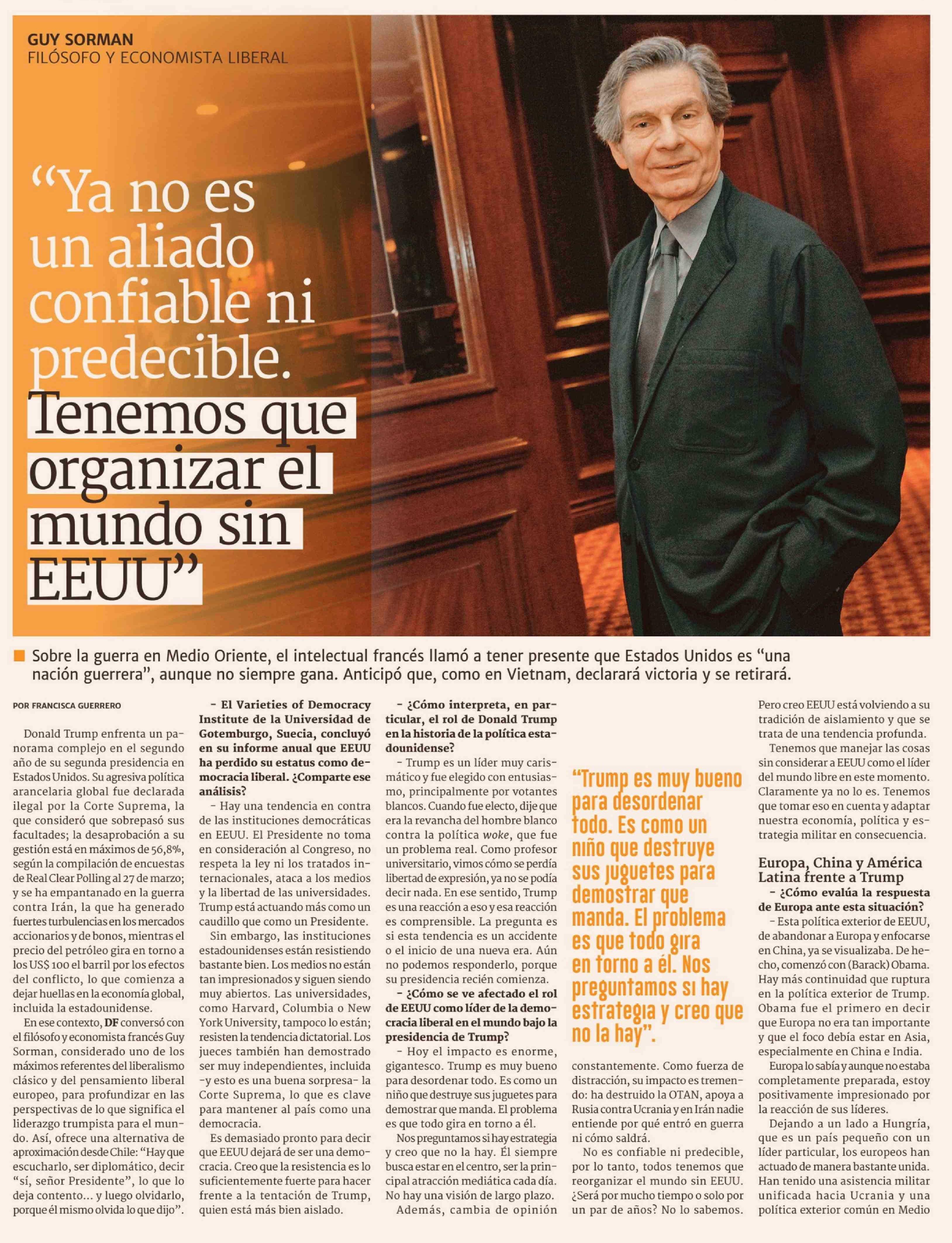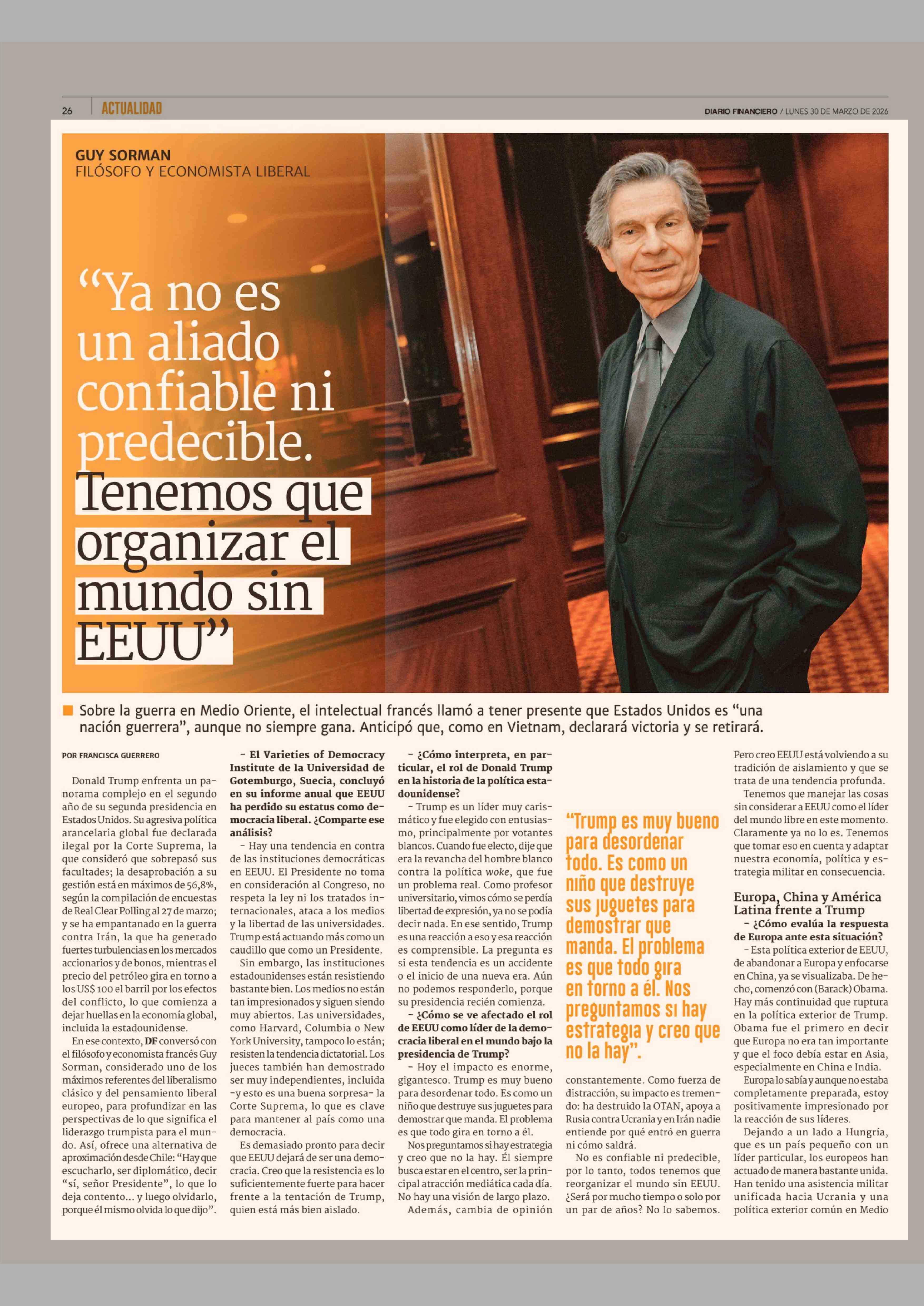 "Ya no es un aliado confiable ni predecible. Tenemos que organizar el mundo sin EEUU" 30-03-2026 Diario Financiero |