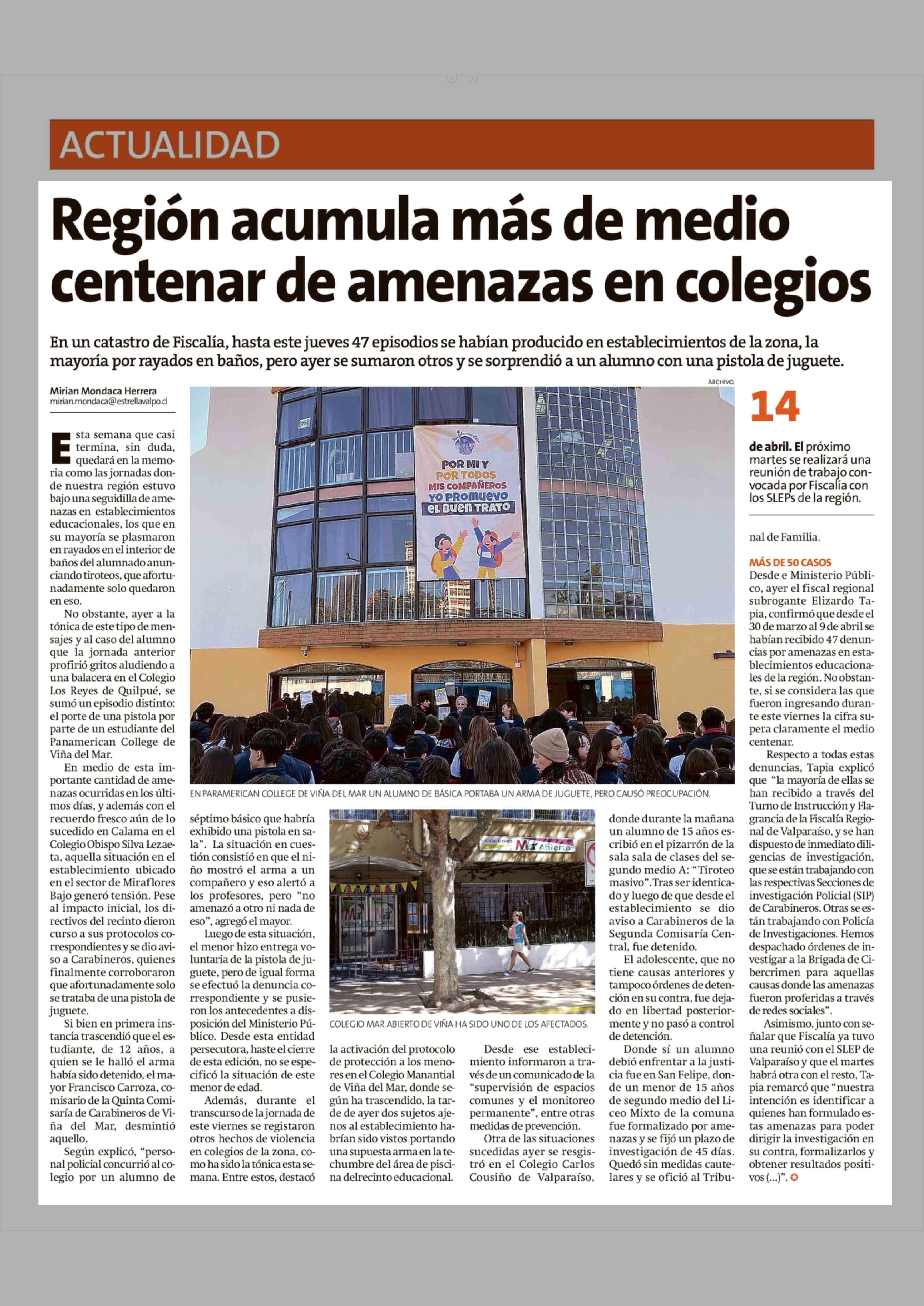 Región acumula más de medio centenar de amenazas en colegios 11-04-2026 La Estrella de Valparaíso |
