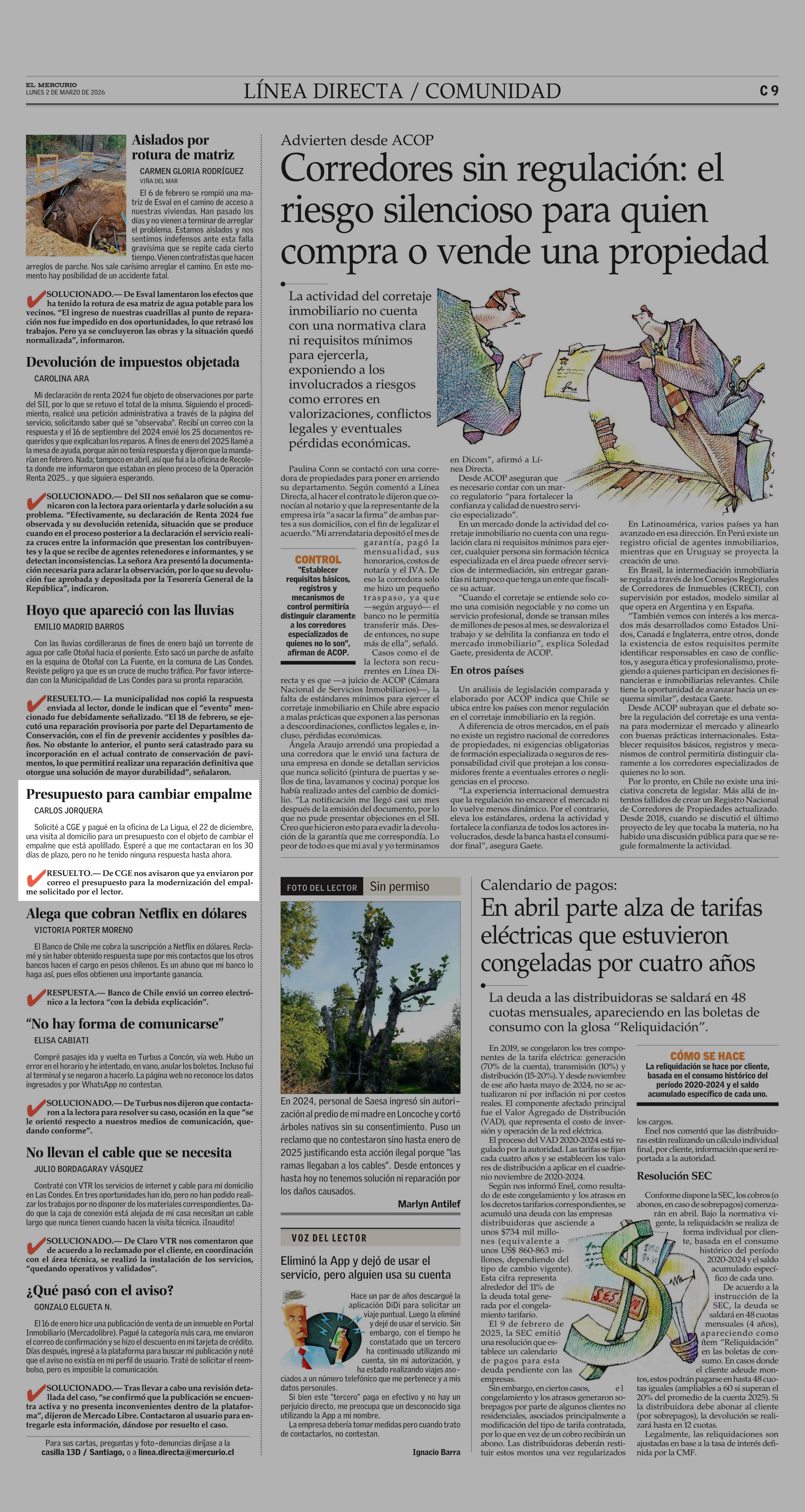 Presupuesto para cambiar empalme 02-03-2026 El Mercurio |