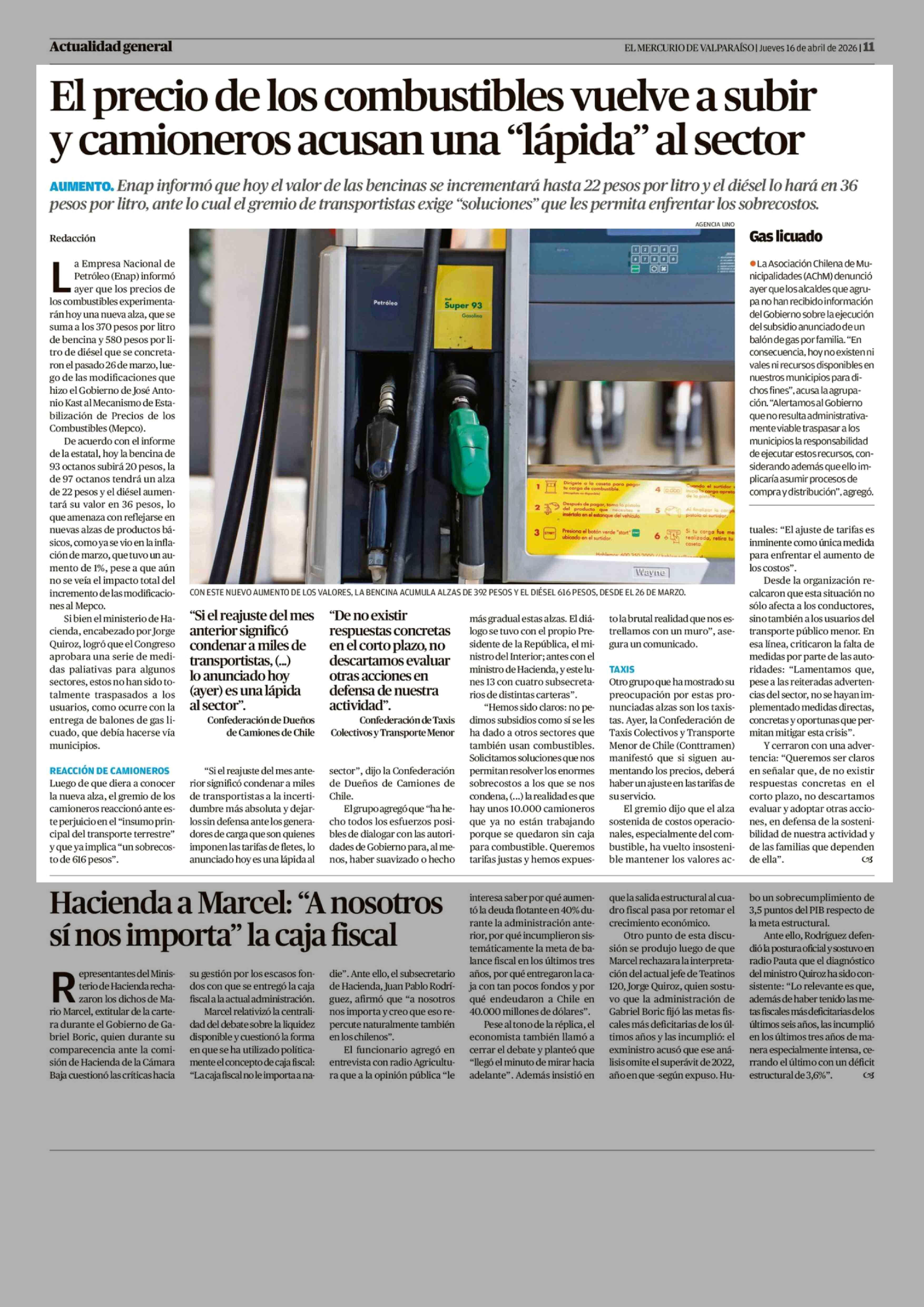 El precio de los combustibles vuelve a subir y camioneros acusan una "lápida" al sector 16-04-2026 El Mercurio de Valparaíso |