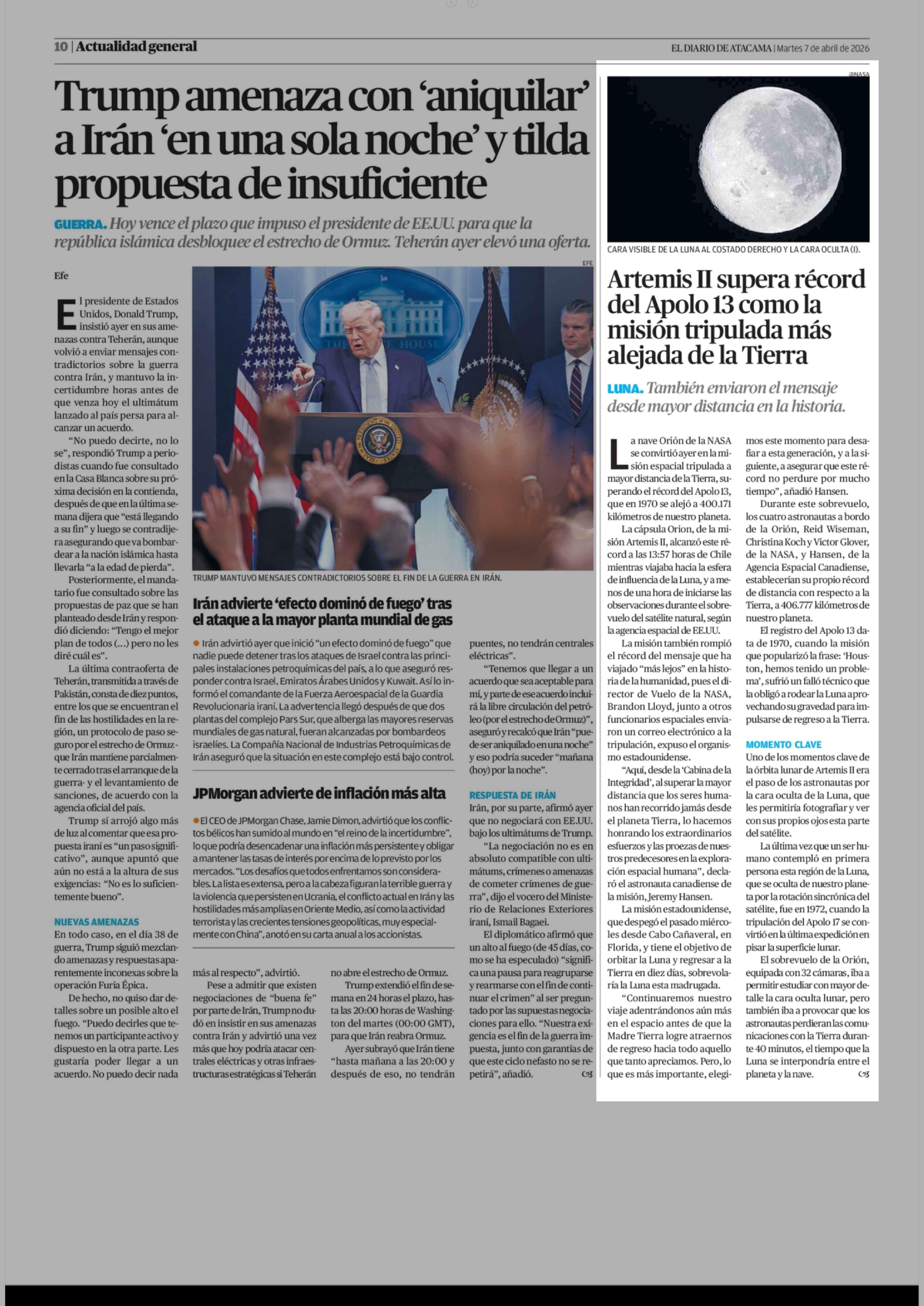 Artemis II supera récord del Apolo 13 como la misión tripulada más alejada de la Tierra 07-04-2026 El Diario de Atacama |
