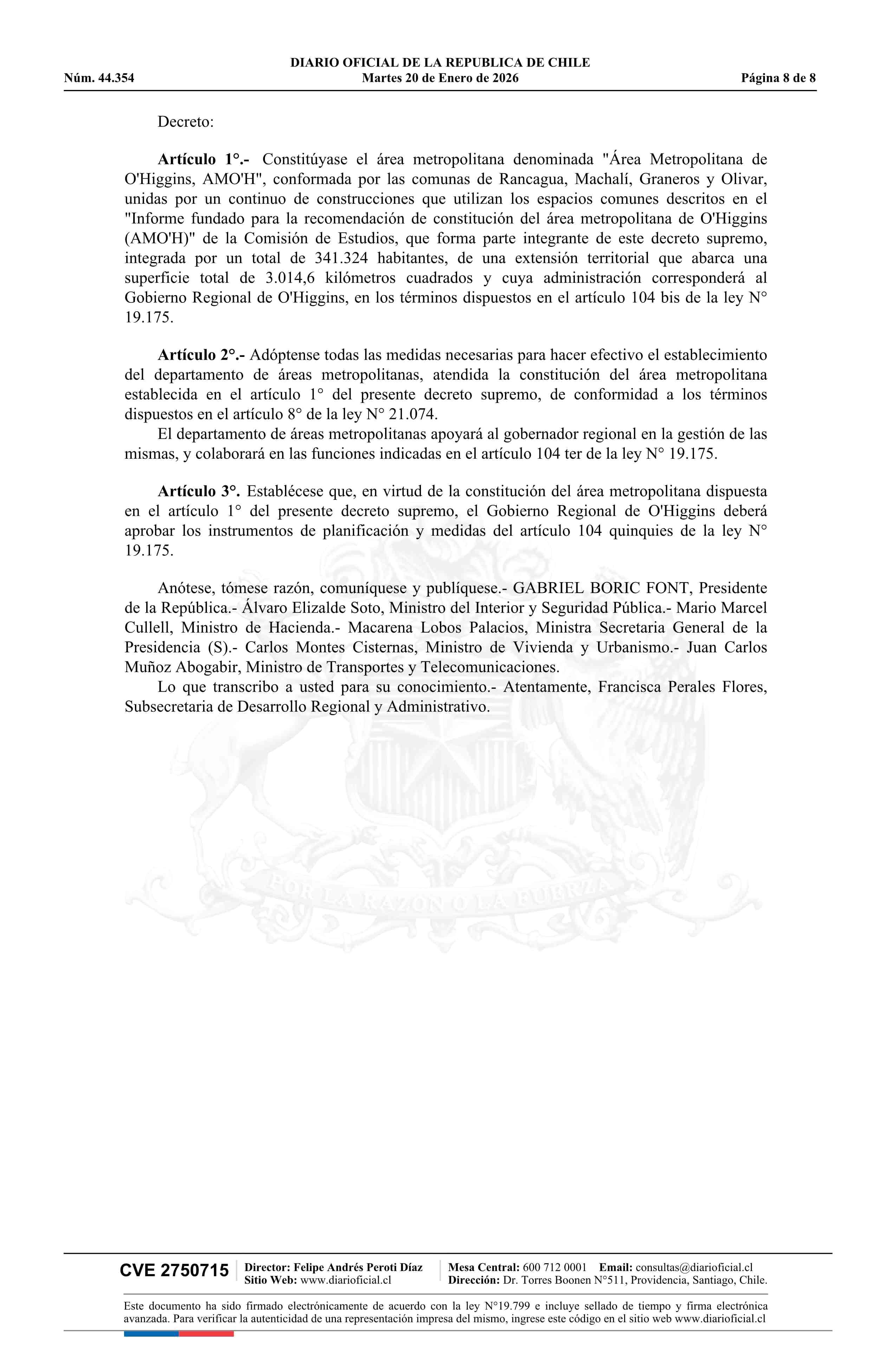 Decreto número 86, de 2025.- Constituye Área Metropolitana de O'Higgins