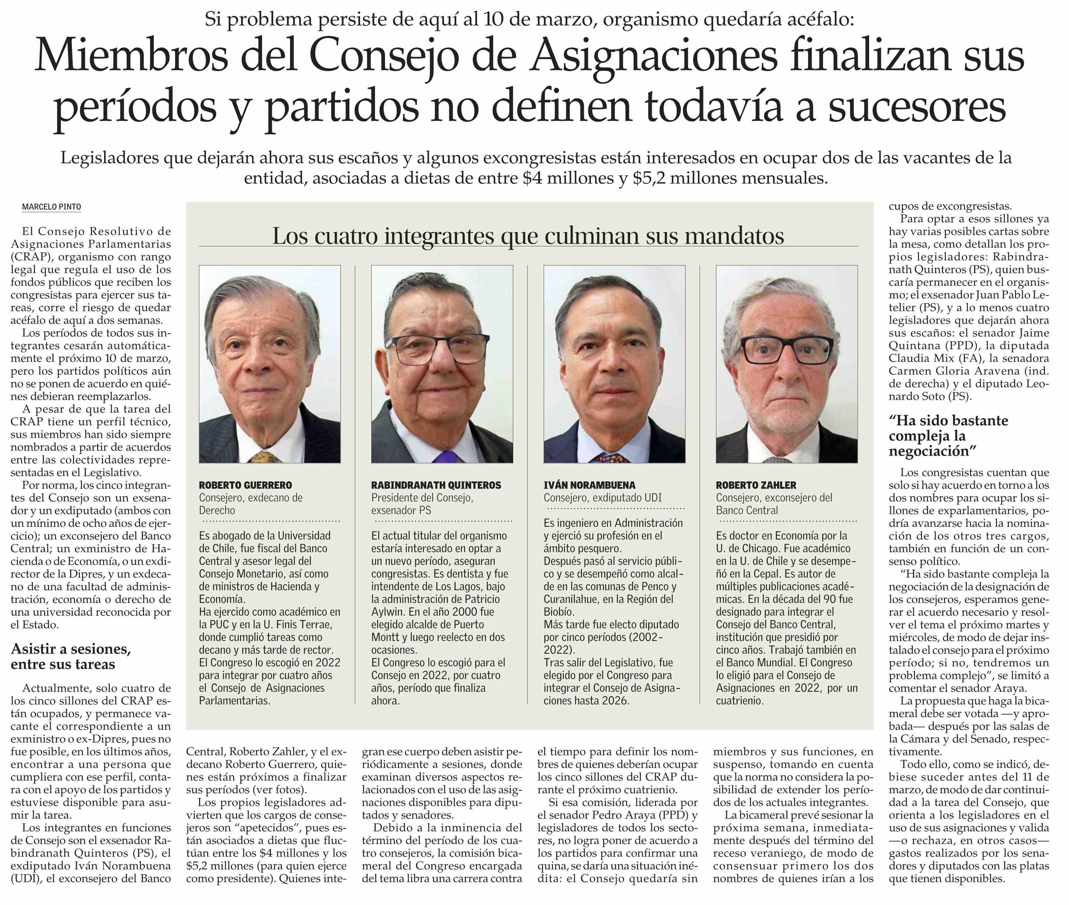 Miembros del Consejo de Asignaciones finalizan sus períodos y partidos no definen todavía a sucesores 26-02-2026 El Mercurio |