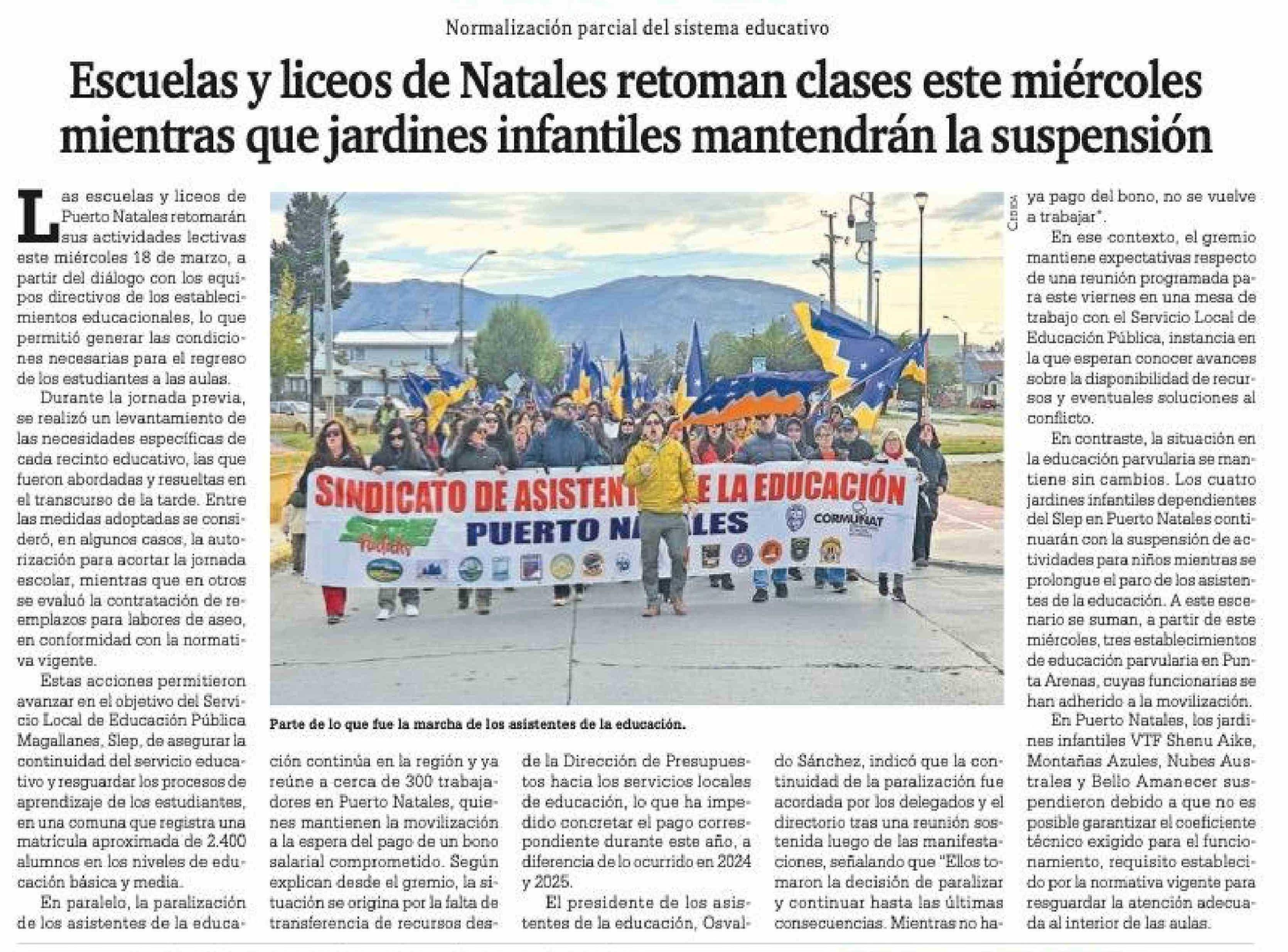 Título: Escuelas y liceos de Natales retoman clases este miércoles mientras que jardines infantiles mantendrán la suspensión