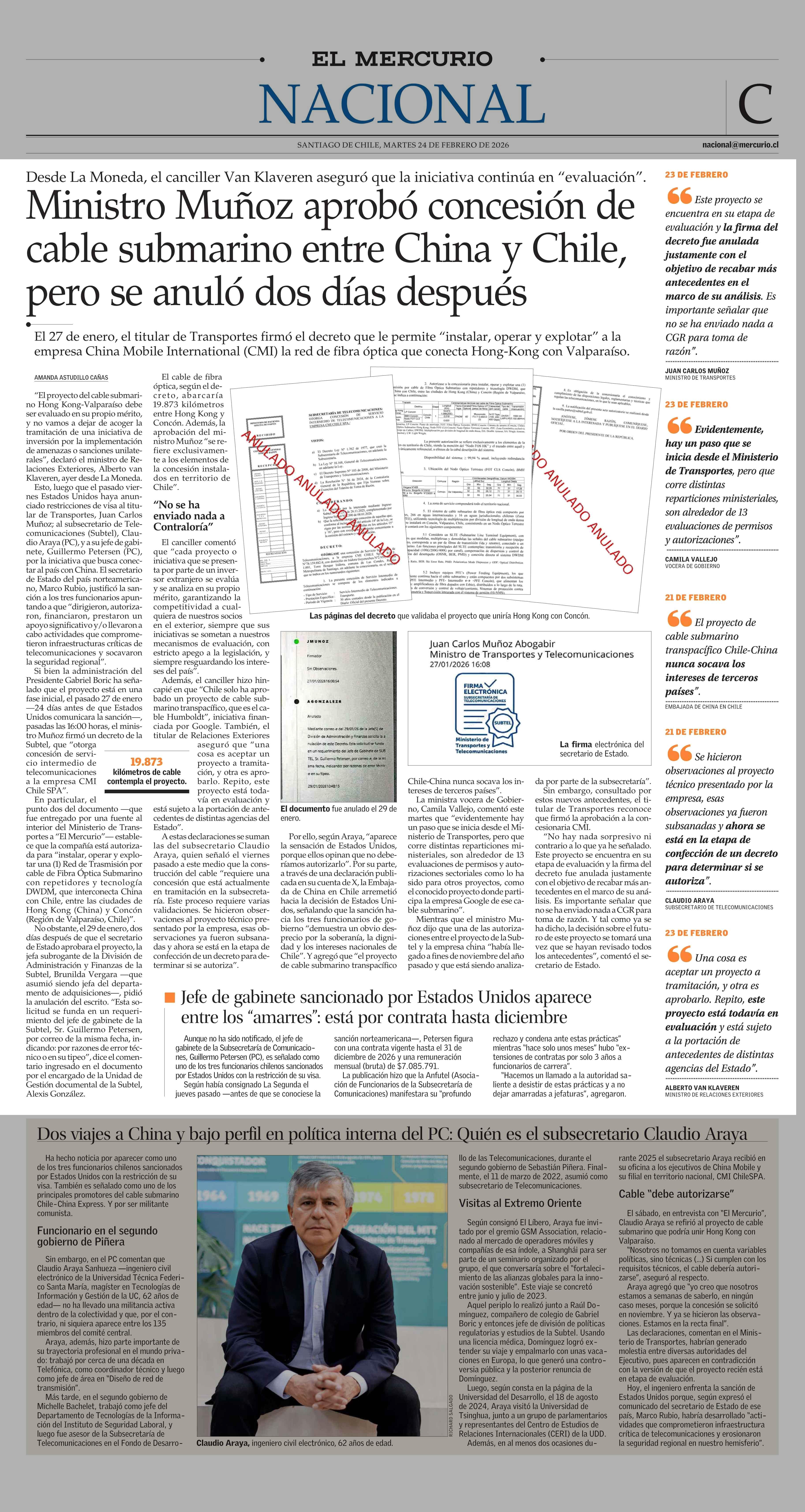 Ministro Muñoz aprobó concesión de cable submarino entre China y Chile, pero se anuló dos días después 24-02-2026 El Mercurio |