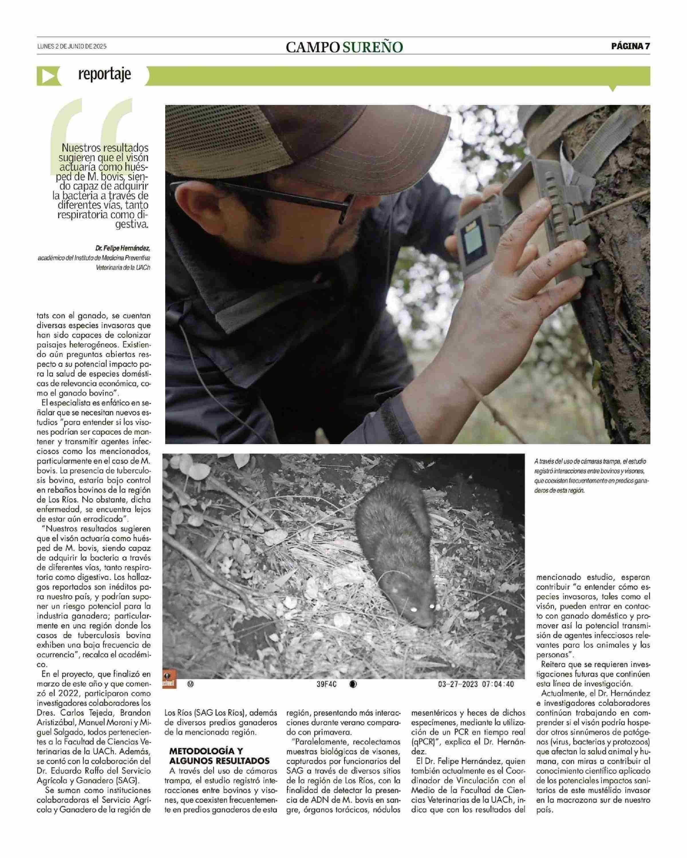 Estudio revela potencial rol del visón como hospedero de tuberculosis bovina en el sur de Chile 02-06-2025 Campo Sureño - Regiones IX, X y XIV |