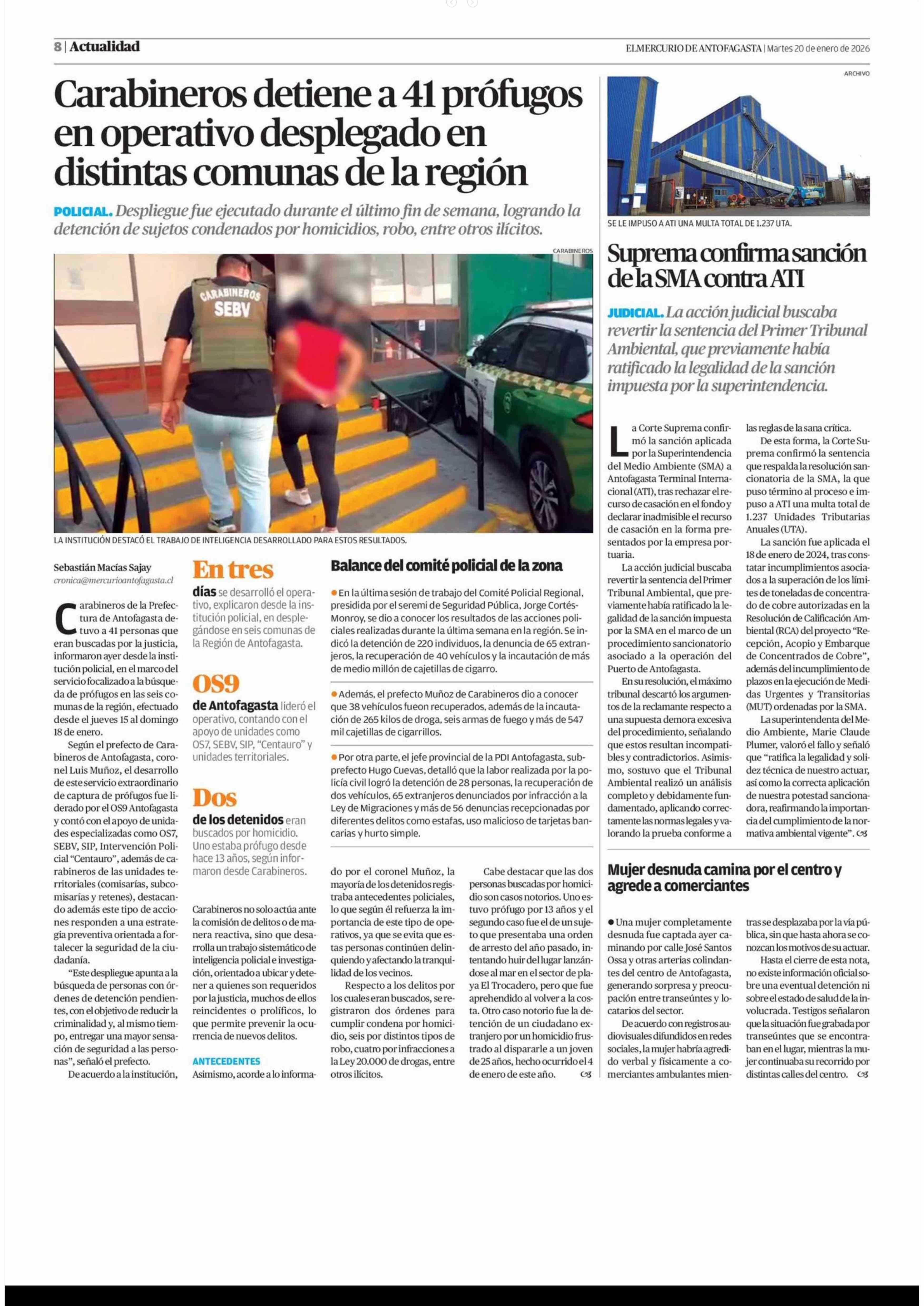 Carabineros detiene a 41 prófugos en operativo desplegado en distintas comunas de la región 20-01-2026 El Mercurio de Antofagasta |