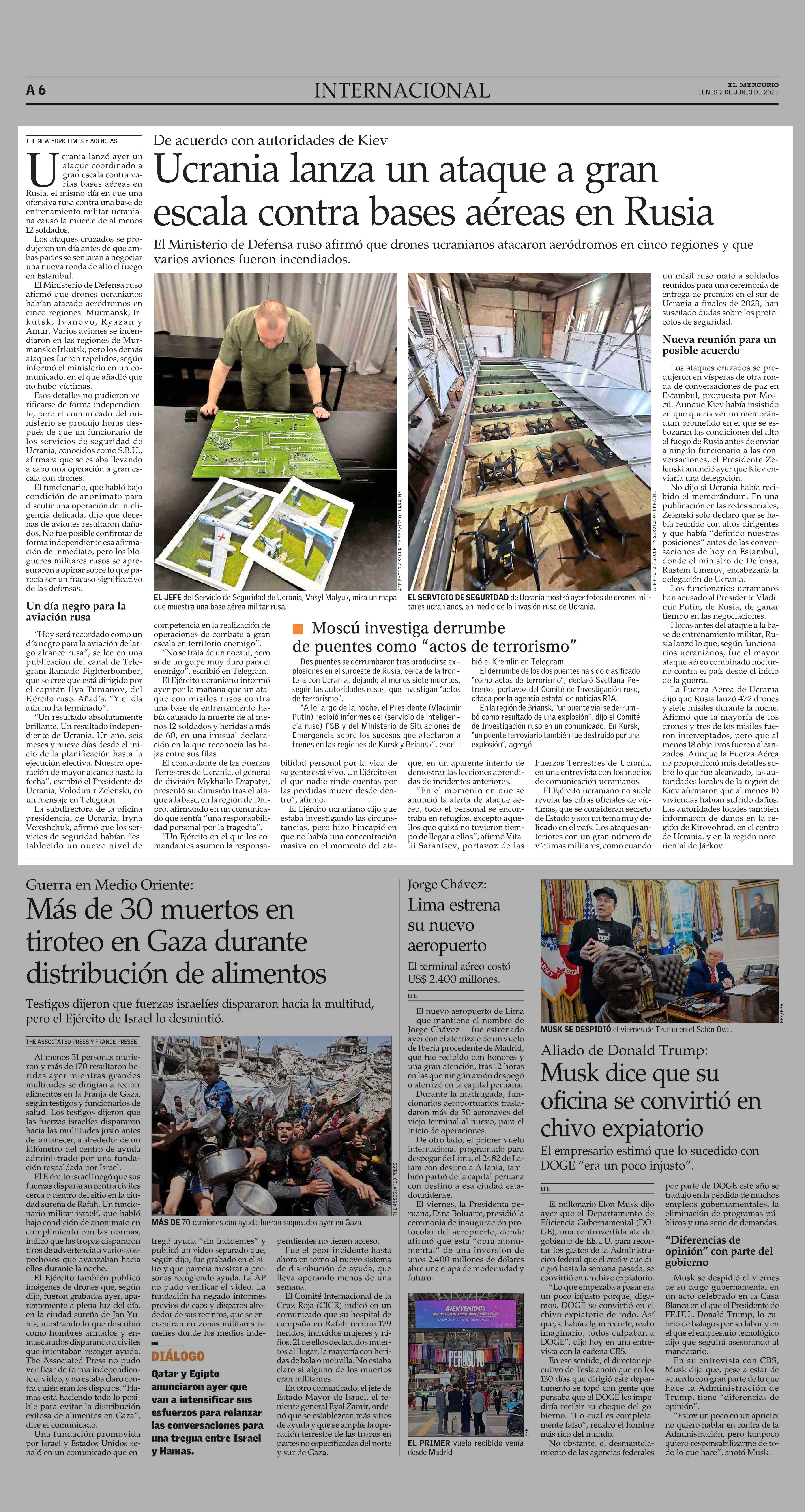 Ucrania lanza un ataque a gran escala contra bases aéreas en Rusia 02-06-2025 El Mercurio |
