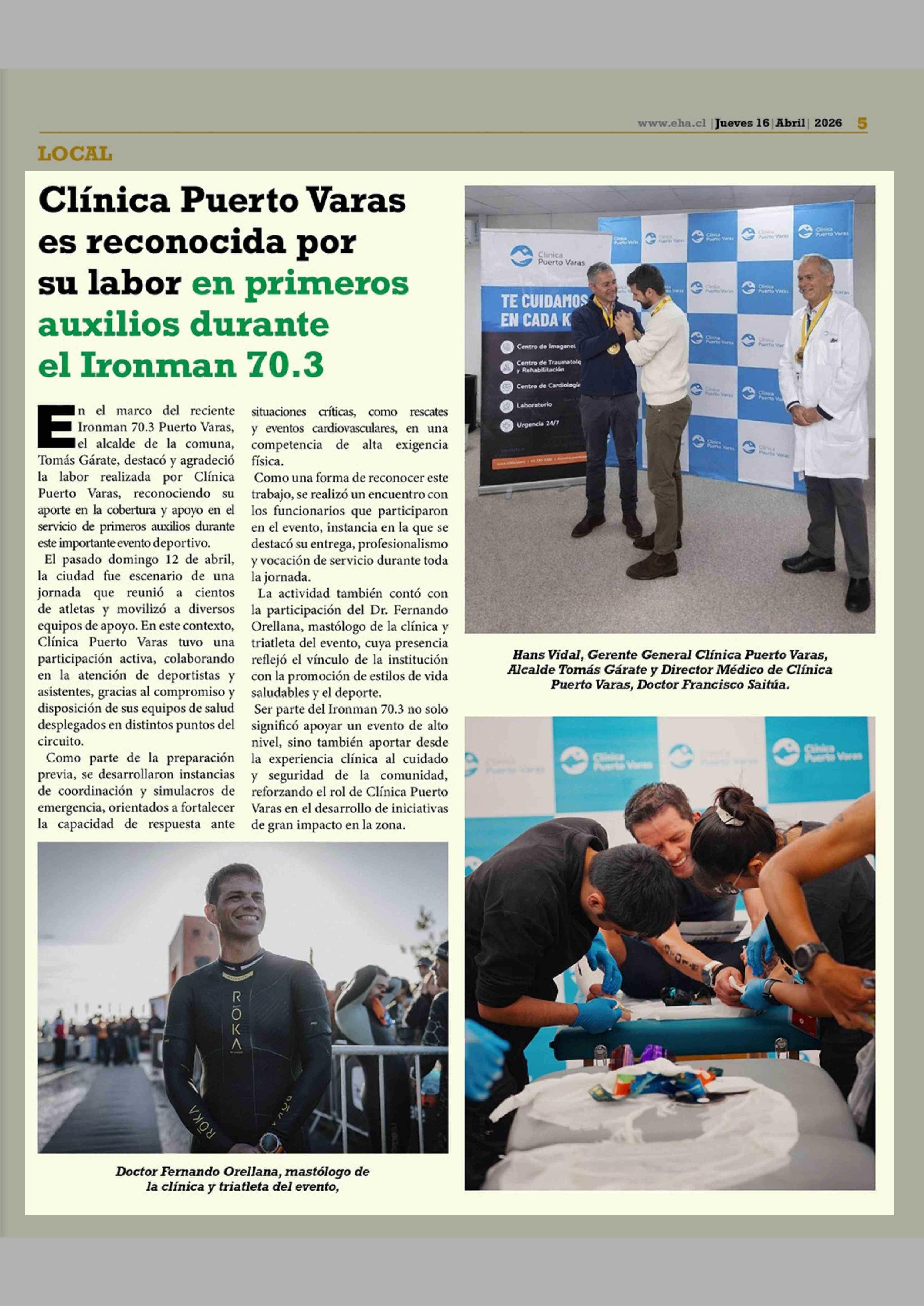 Clínica Puerto Varas es reconocida por su labor en primeros auxilios durante el Ironman 70.3 16-04-2026 El Heraldo Austral |