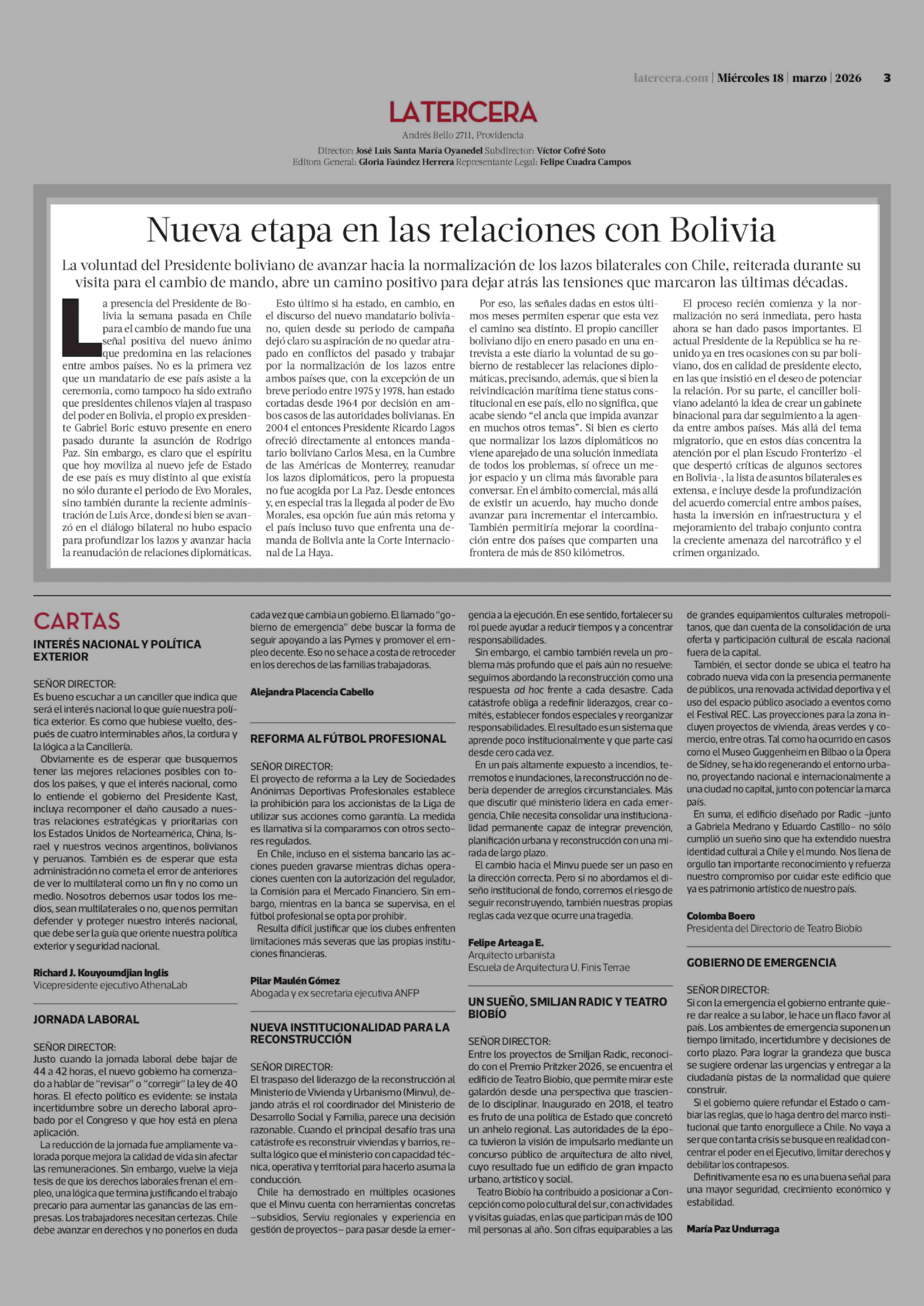 Editorial: Nueva etapa en las relaciones con Bolivia 18-03-2026 La Tercera |