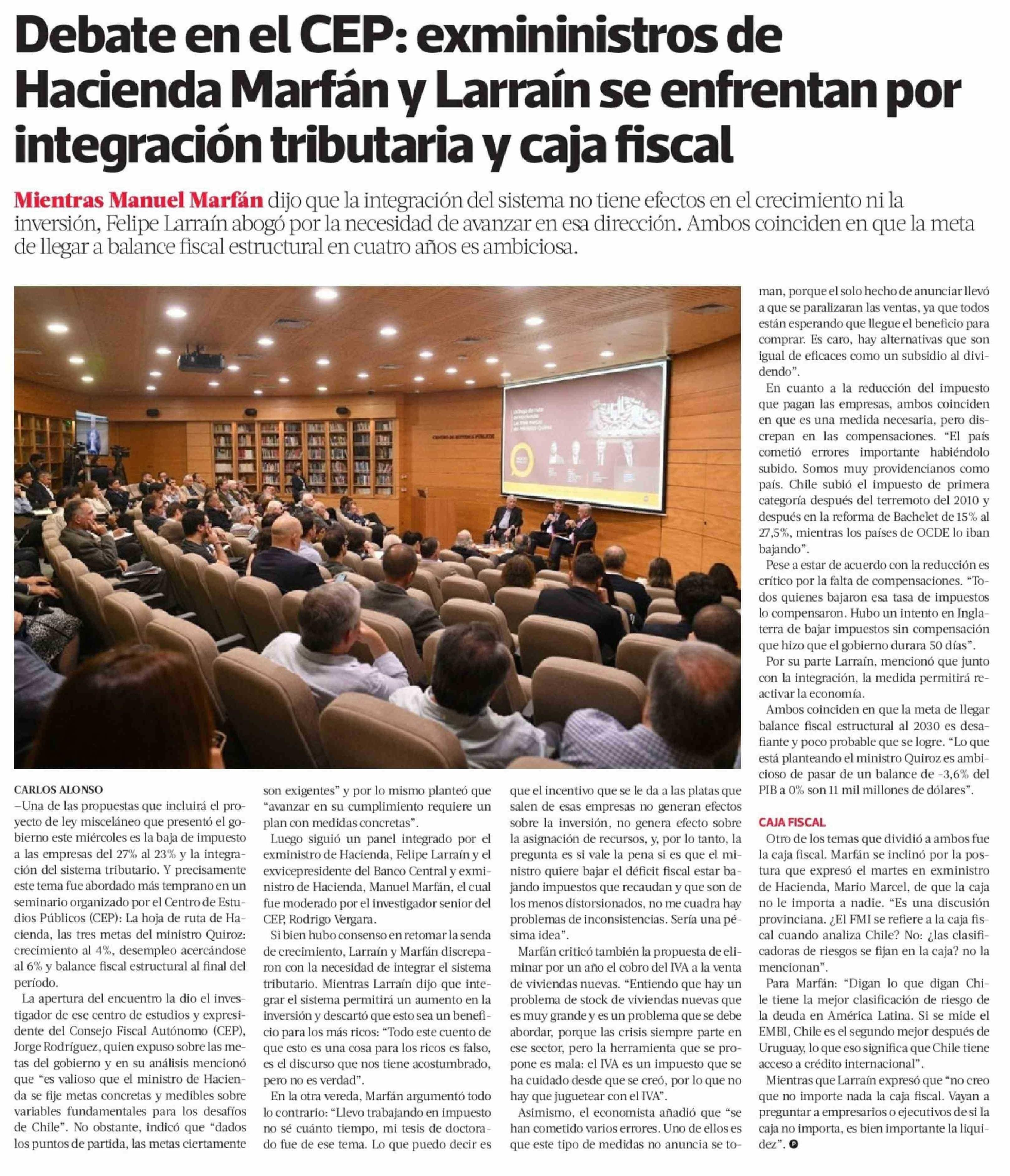 Debate en el CEP: exmininistros de Hacienda Marfán y Larraín se enfrentan por integración tributaria y caja fiscal 16-04-2026 La Tercera |