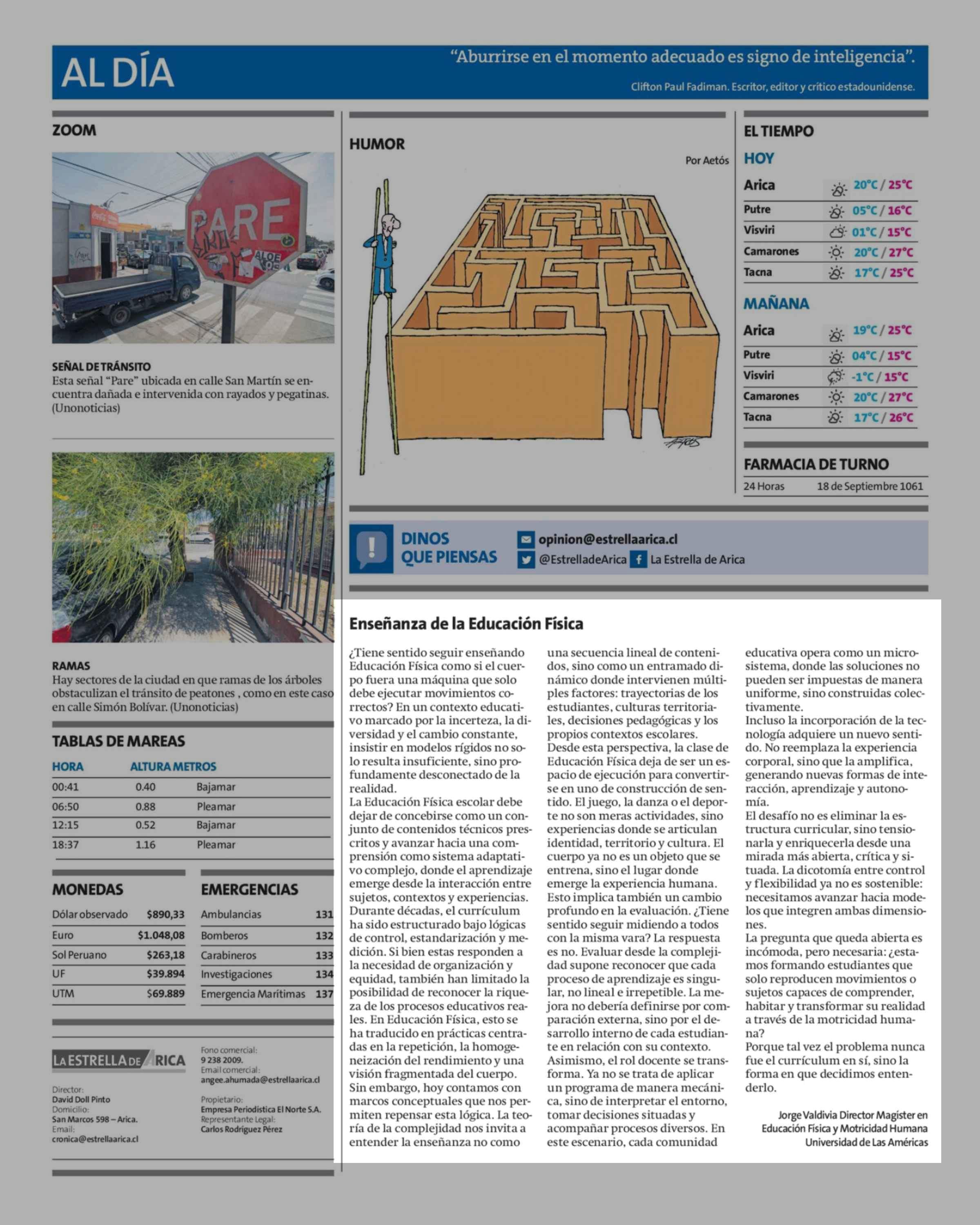 Cartas: Enseñanza de la Educación Física 13-04-2026 La Estrella de Arica |