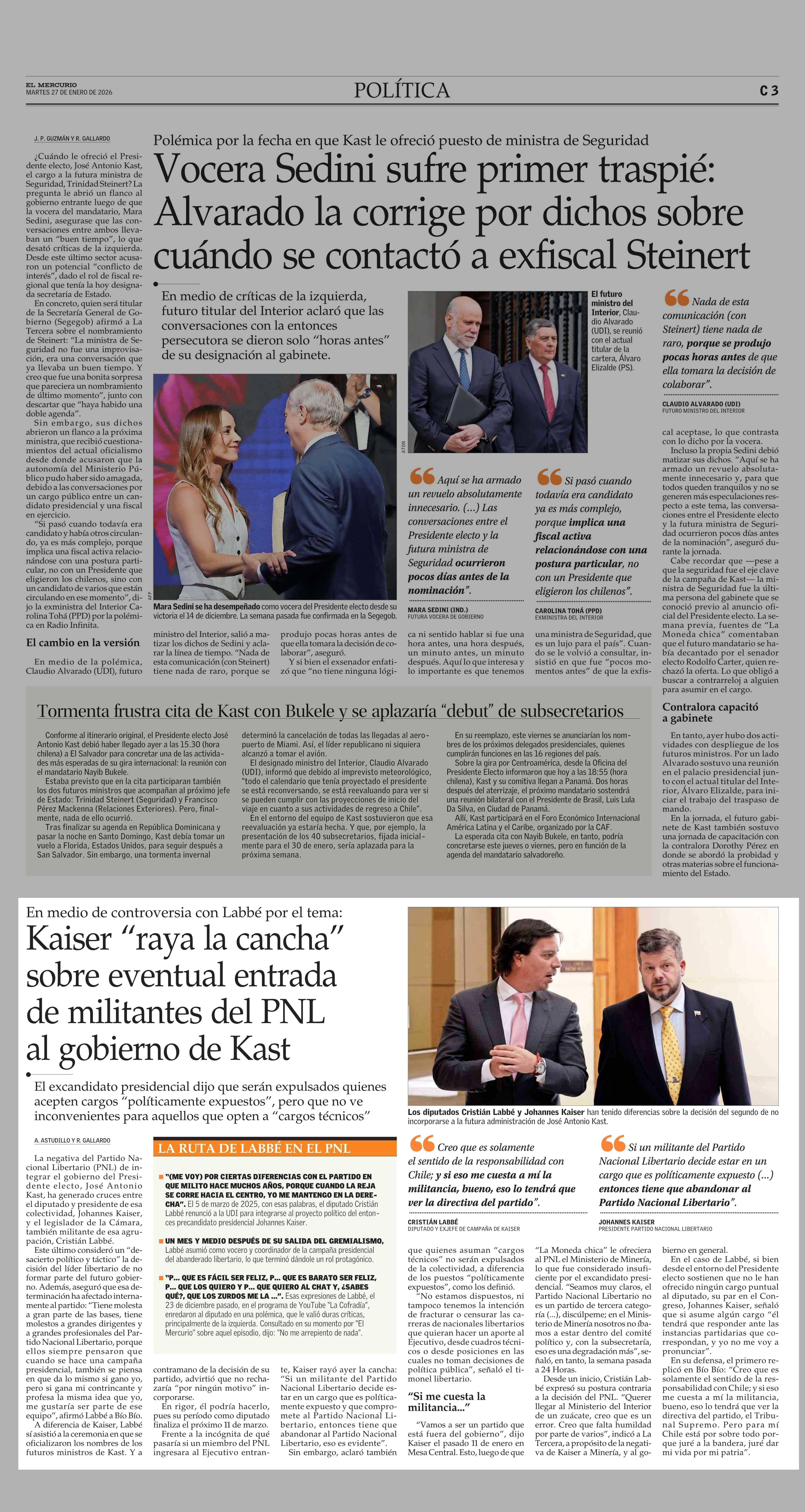 Kaiser “raya la cancha” sobre eventual entrada de militantes del PNL al gobierno de Kast 27-01-2026 El Mercurio |