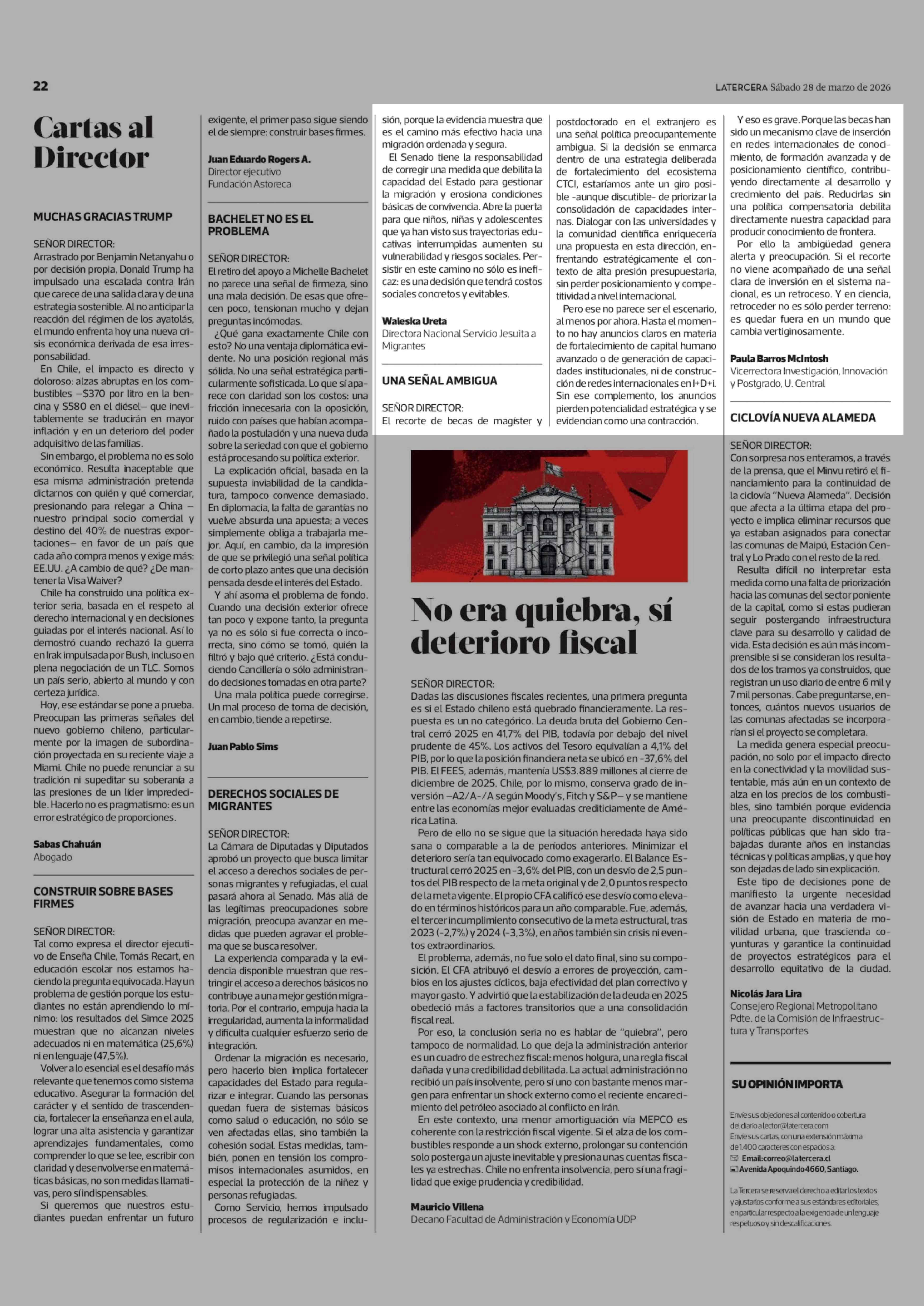 Cartas: UNA SEÑAL AMBIGUA 28-03-2026 La Tercera |