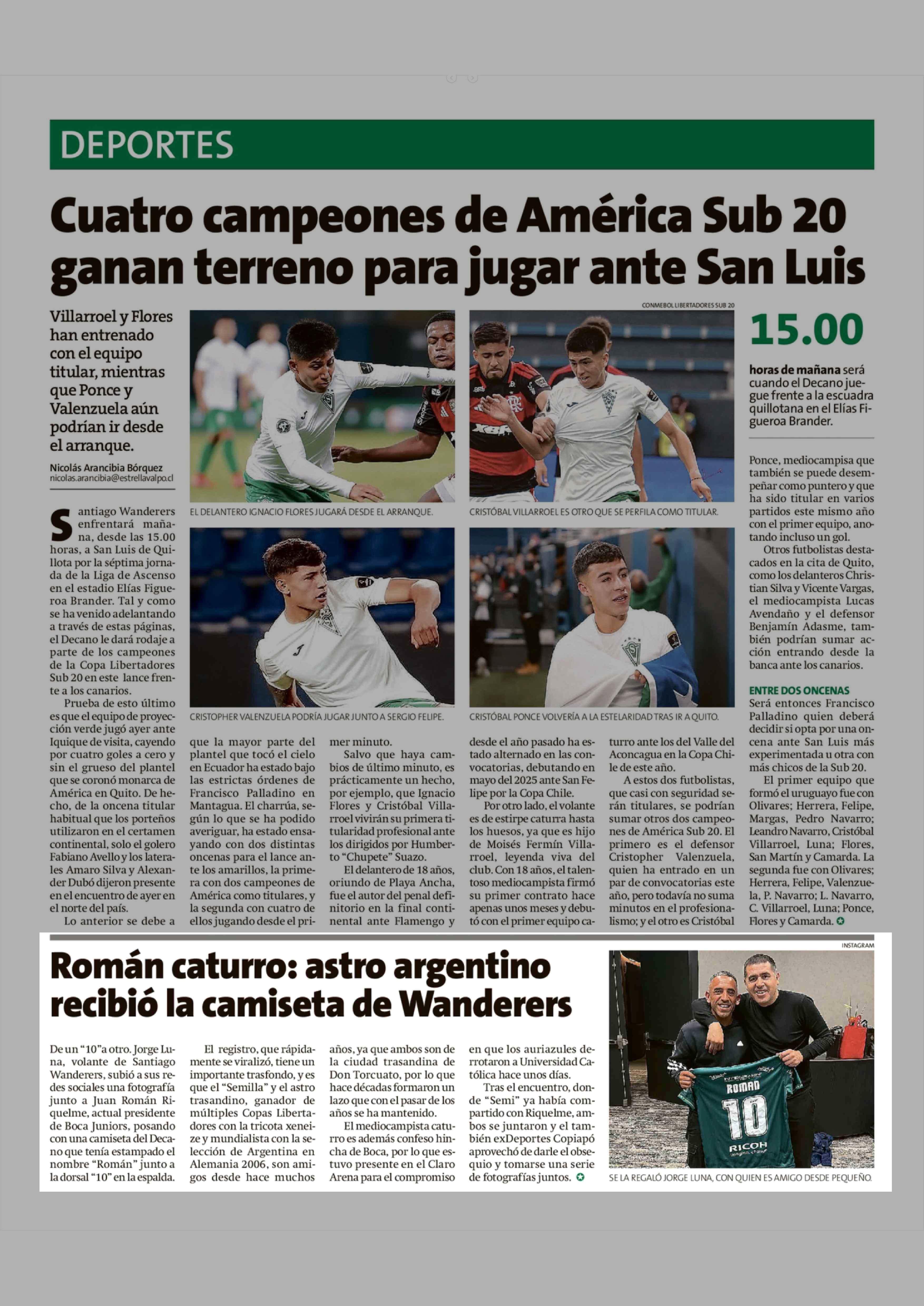 Román caturro: astro argentino recibió la camiseta de Wanderers 11-04-2026 La Estrella de Valparaíso |
