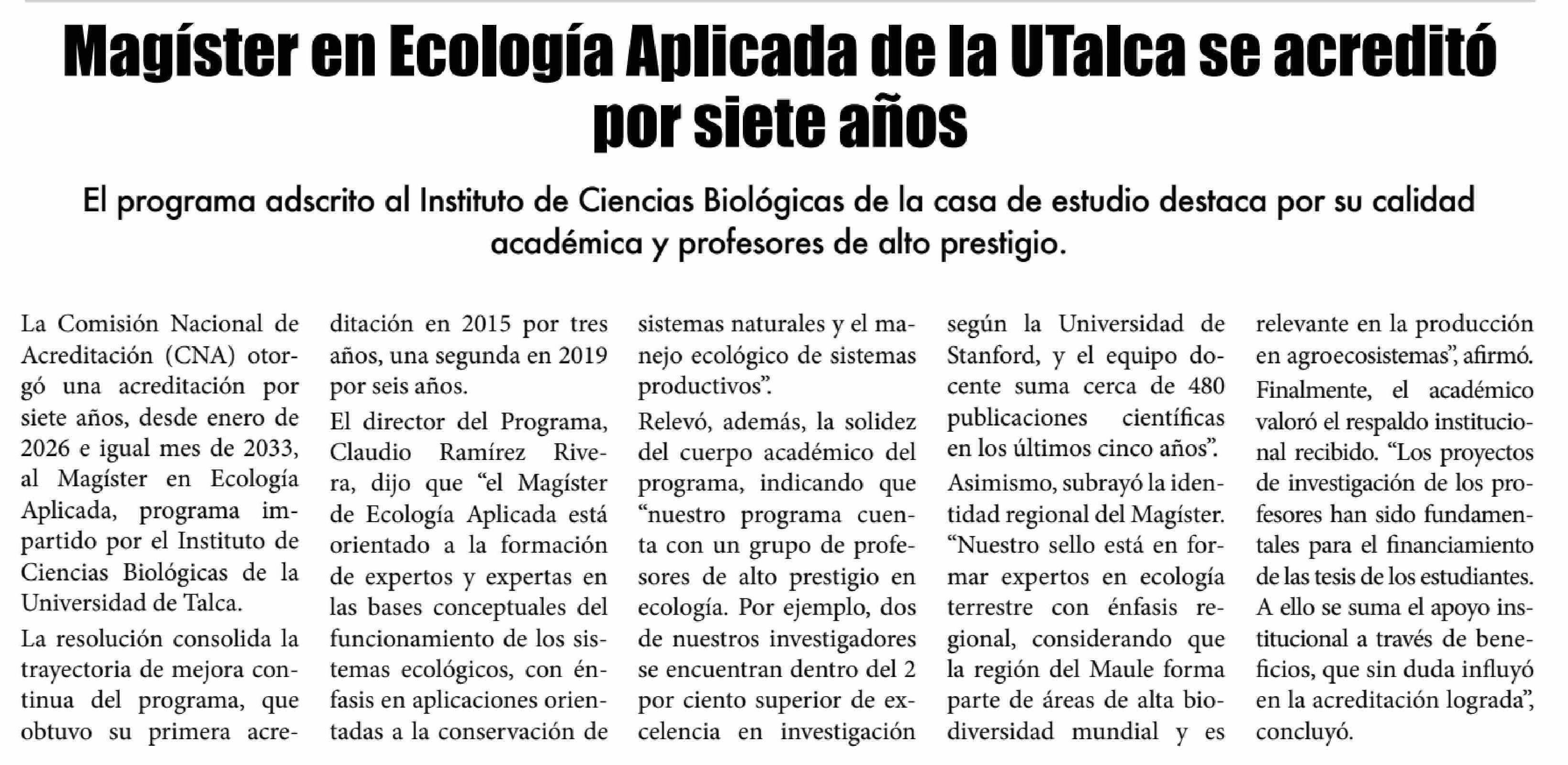 Título: Magister en Ecología Aplicada de la UTalca se acredito por siete años