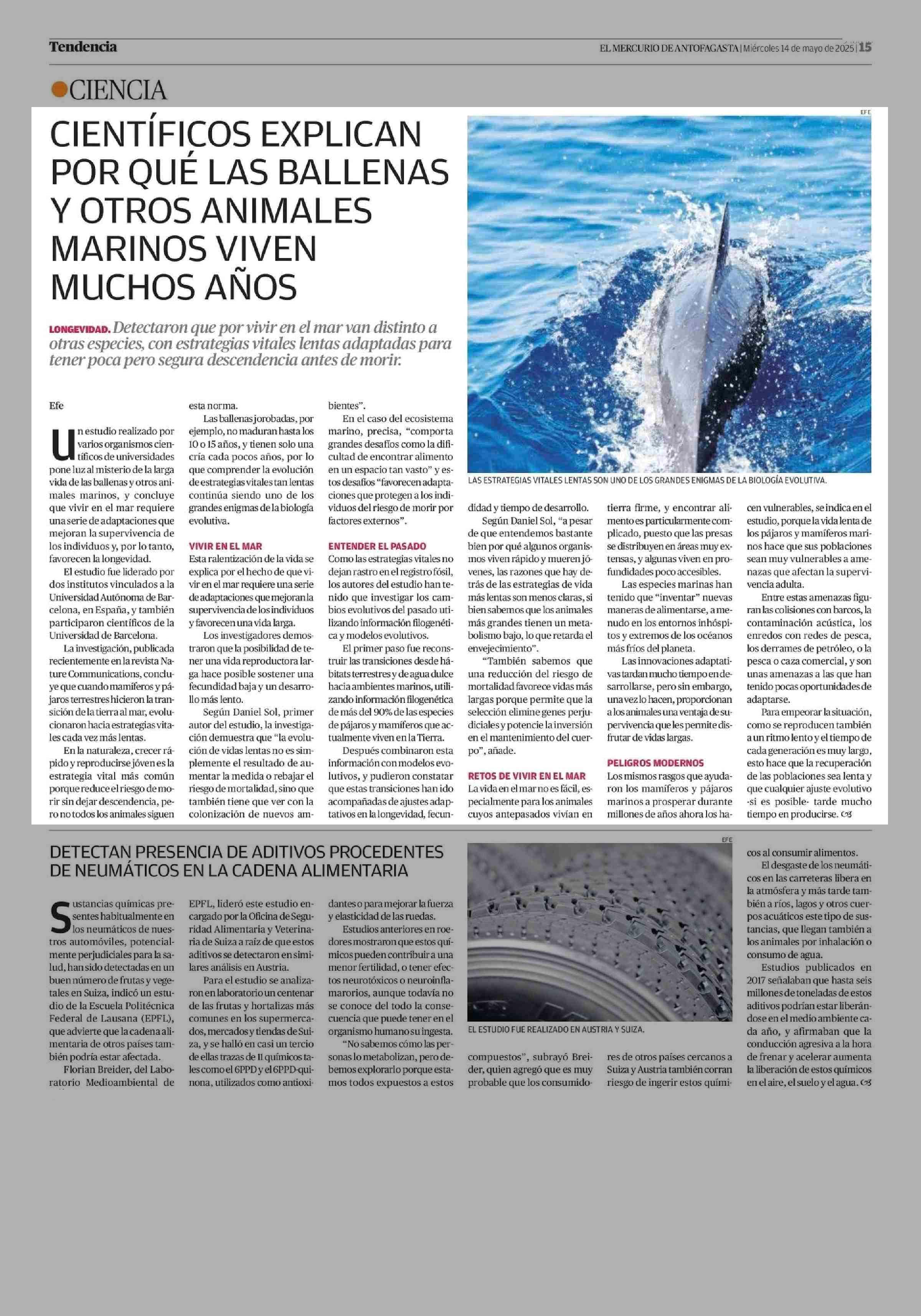 CIENTÍFICOS EXPLICAN POR QUE LAS BALLENAS Y OTROS ANIMALES MARINOS VIVEN MUCHOS ANOS 14-05-2025 El Mercurio de Antofagasta |