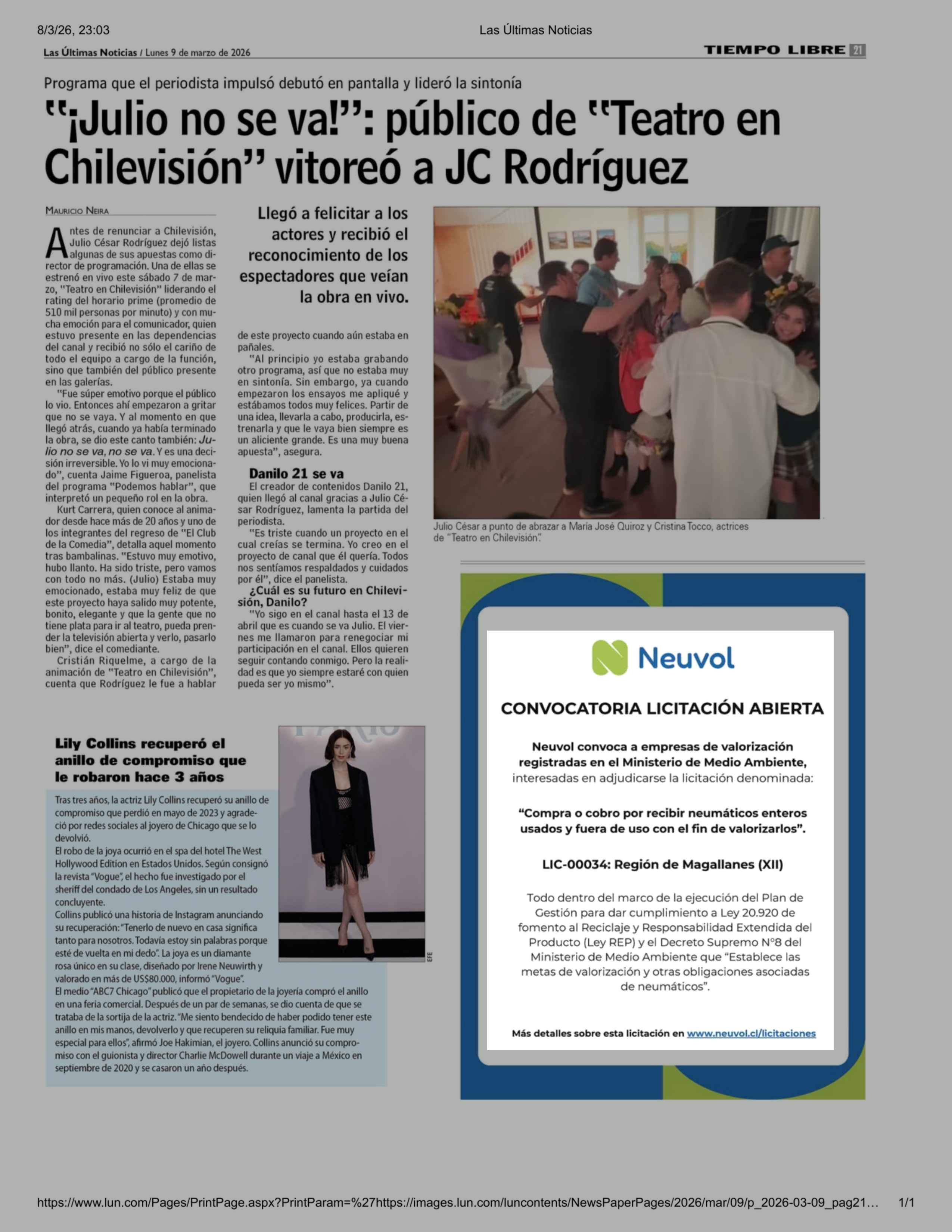 Aviso Licitaciones: CONVOCATORIA LICITACIÓN ABIERTA 09-03-2026 Las Últimas Noticias |