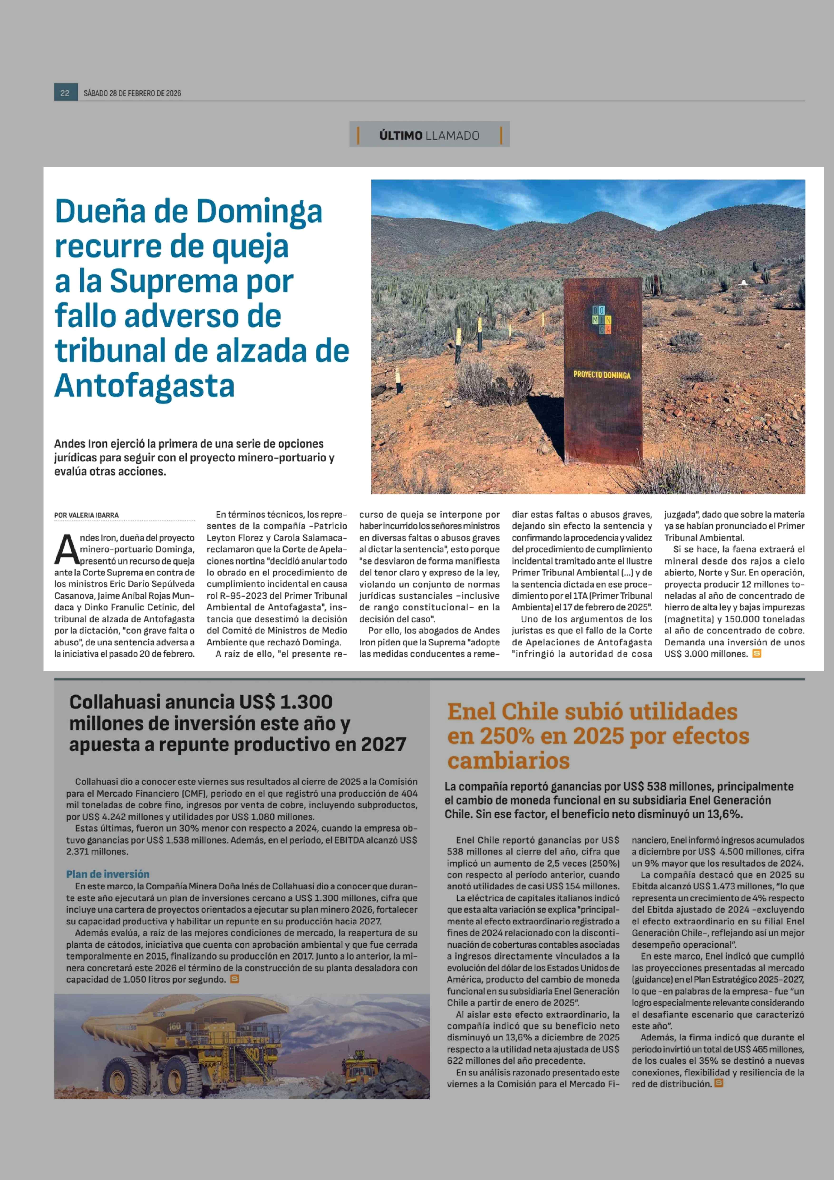 Dueña de Dominga recurre de queja a la Suprema por fallo adverso de tribunal de alzada de Antofagasta 28-02-2026 Diario Financiero |
