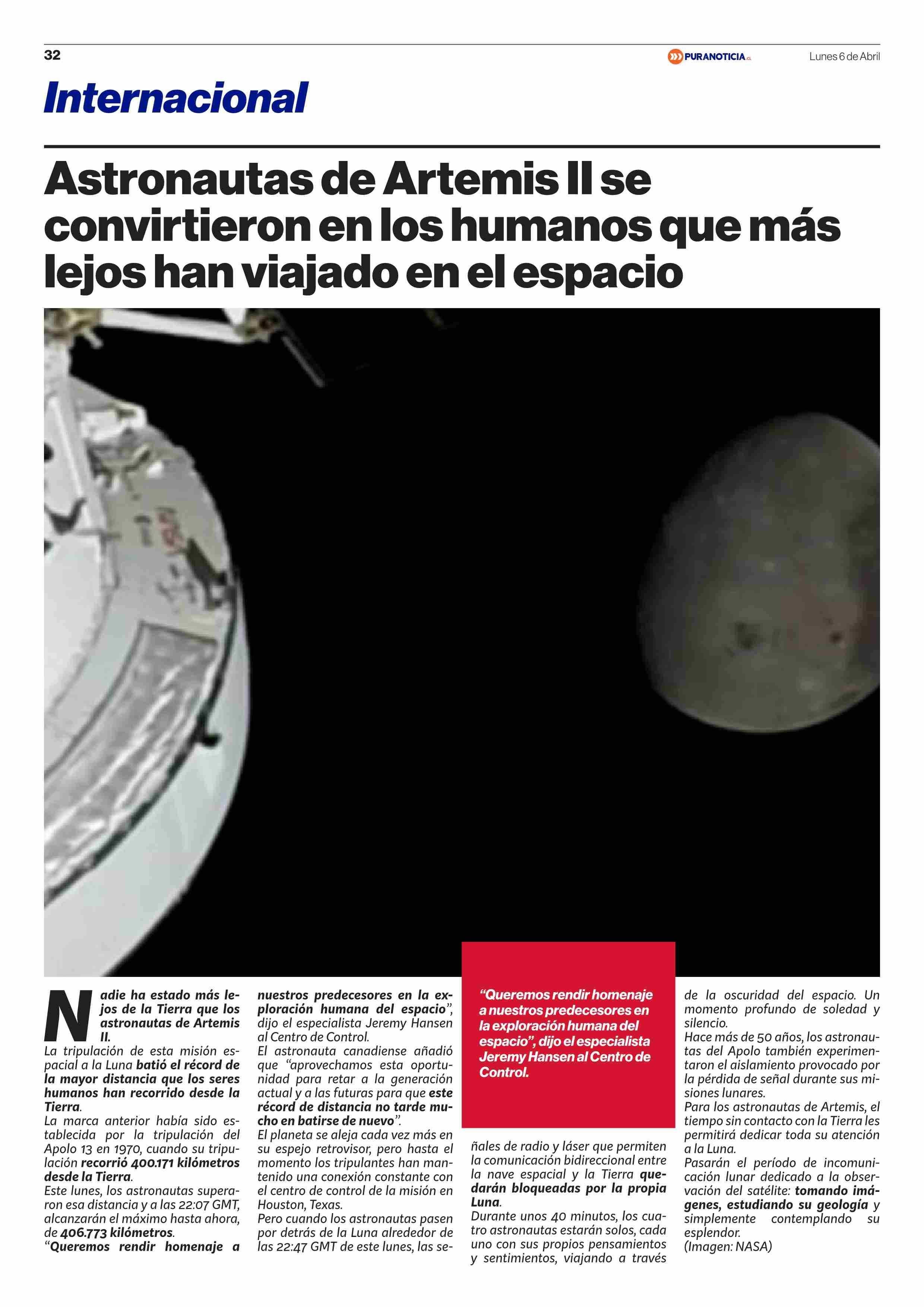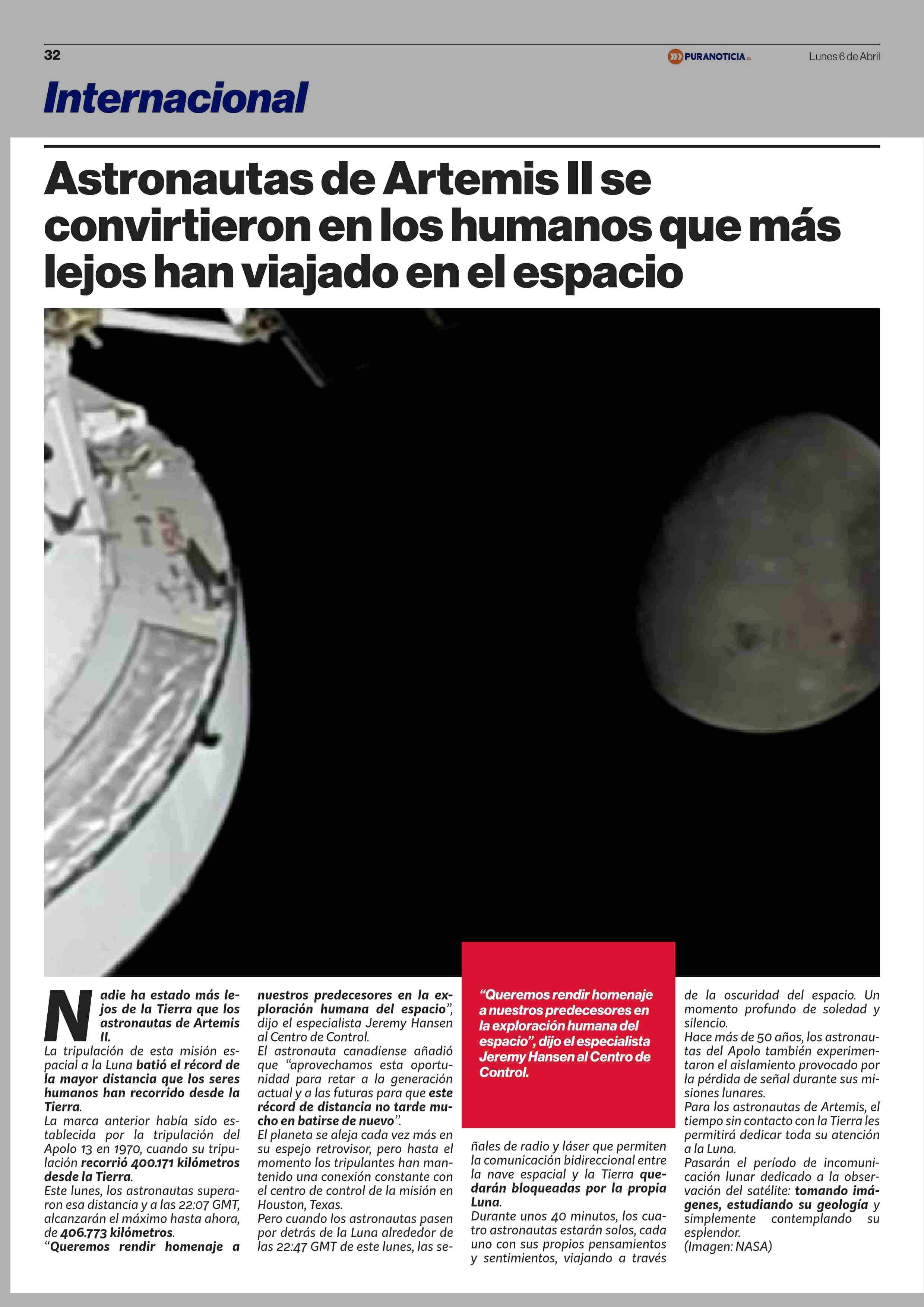 Astronautas de Artemis ll se convirtieron en los humanos que más lejos han viajado en el espacio 06-04-2026 Puranoticia.cl |