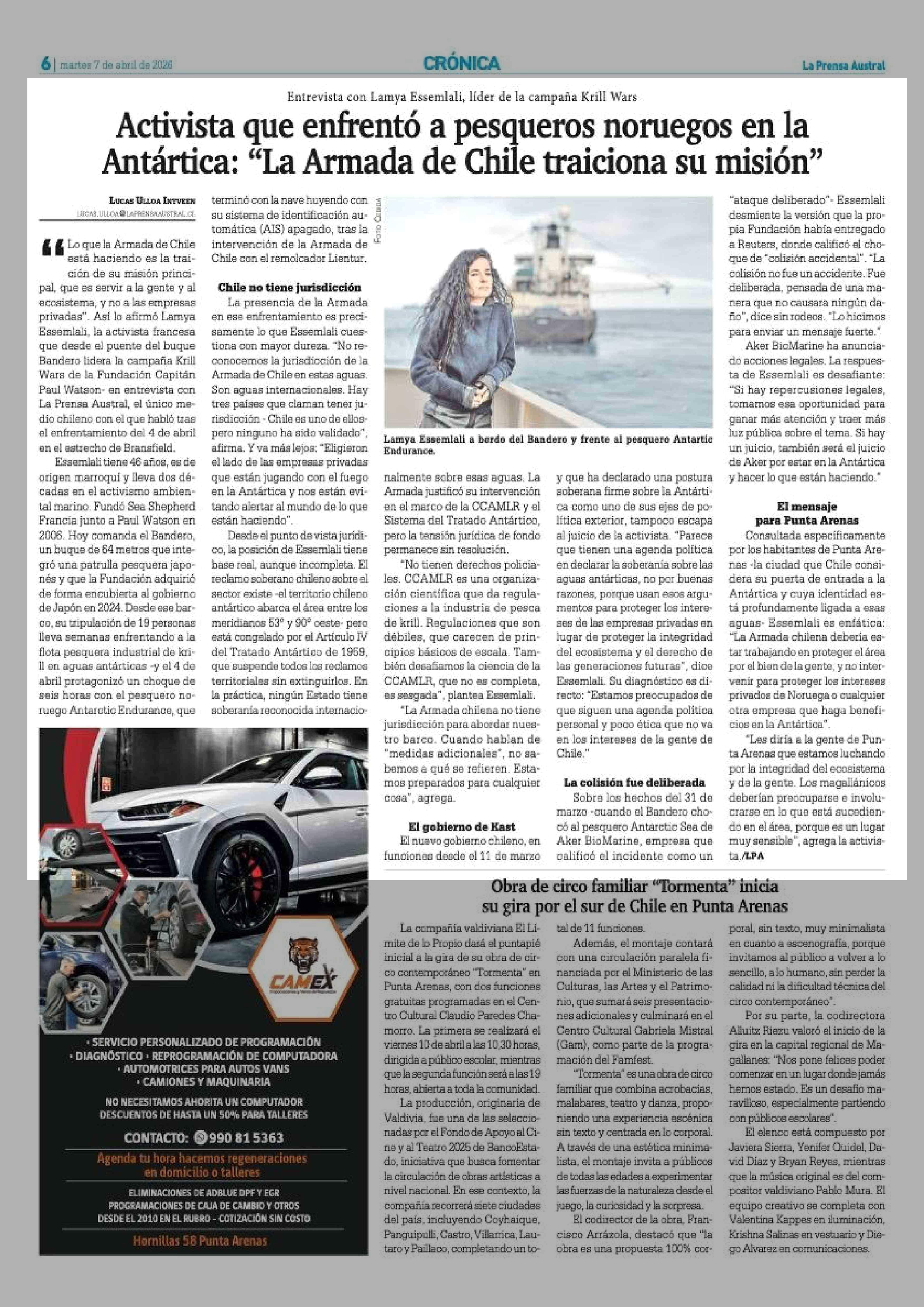 Activista que enfrentó a pesqueros noruegos en la Antártica: "La Armada de Chile traiciona su misión" 07-04-2026 La Prensa Austral |