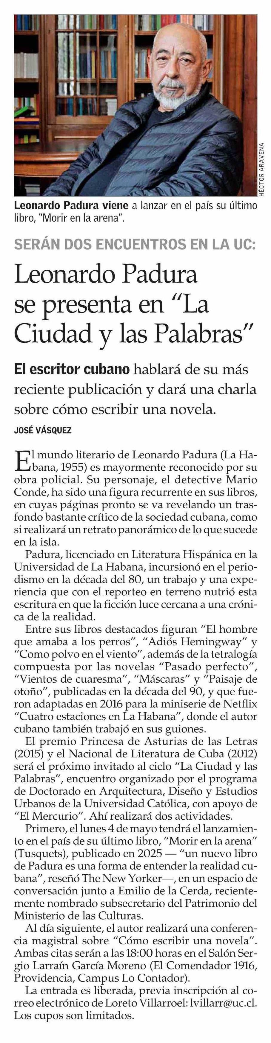 Leonardo Padura se presenta en “La Ciudad y las Palabras” 17-04-2026 El Mercurio |