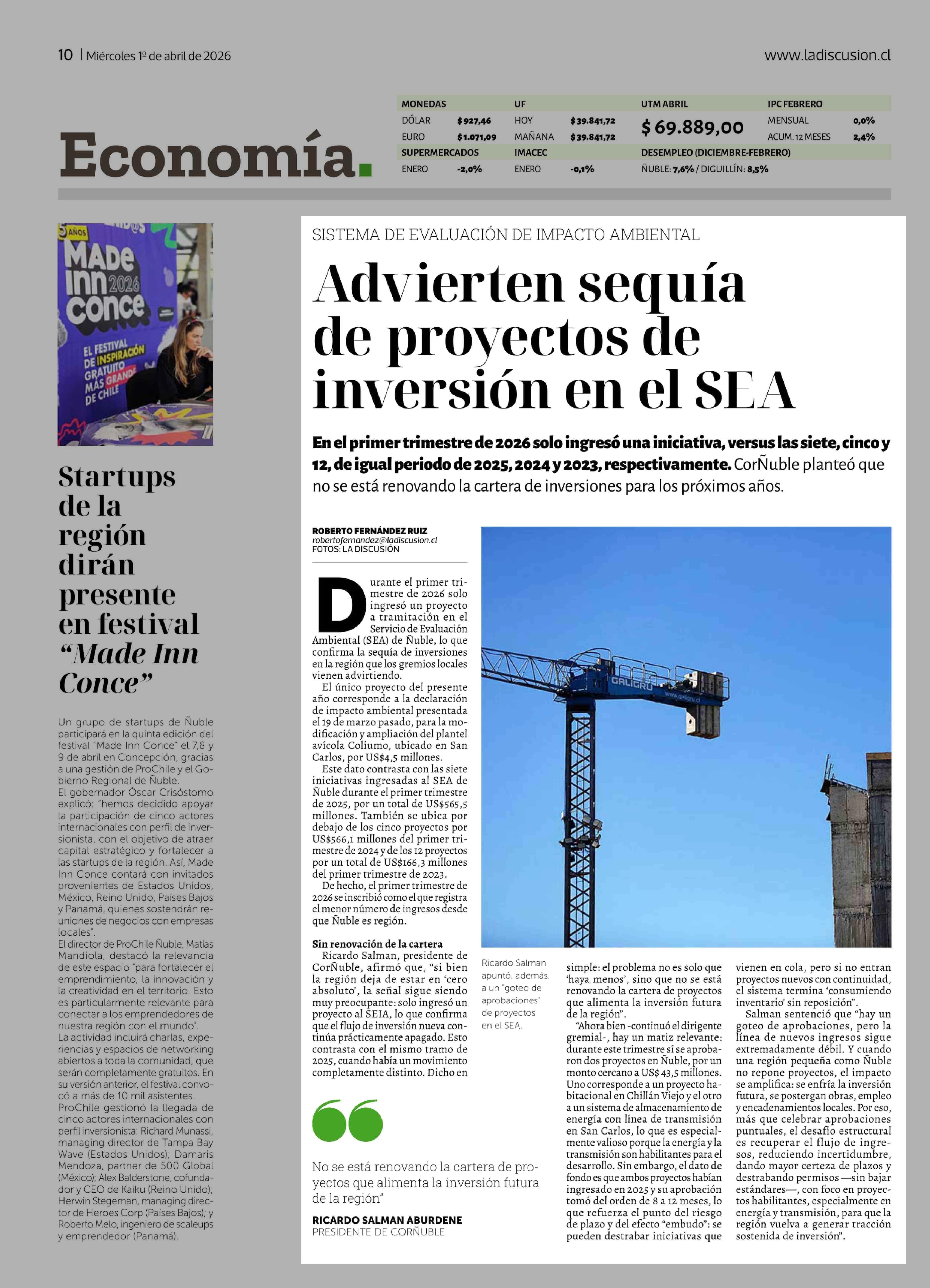 Advierten sequía de proyectos de inversión en el SEA 01-04-2026 La Discusión |