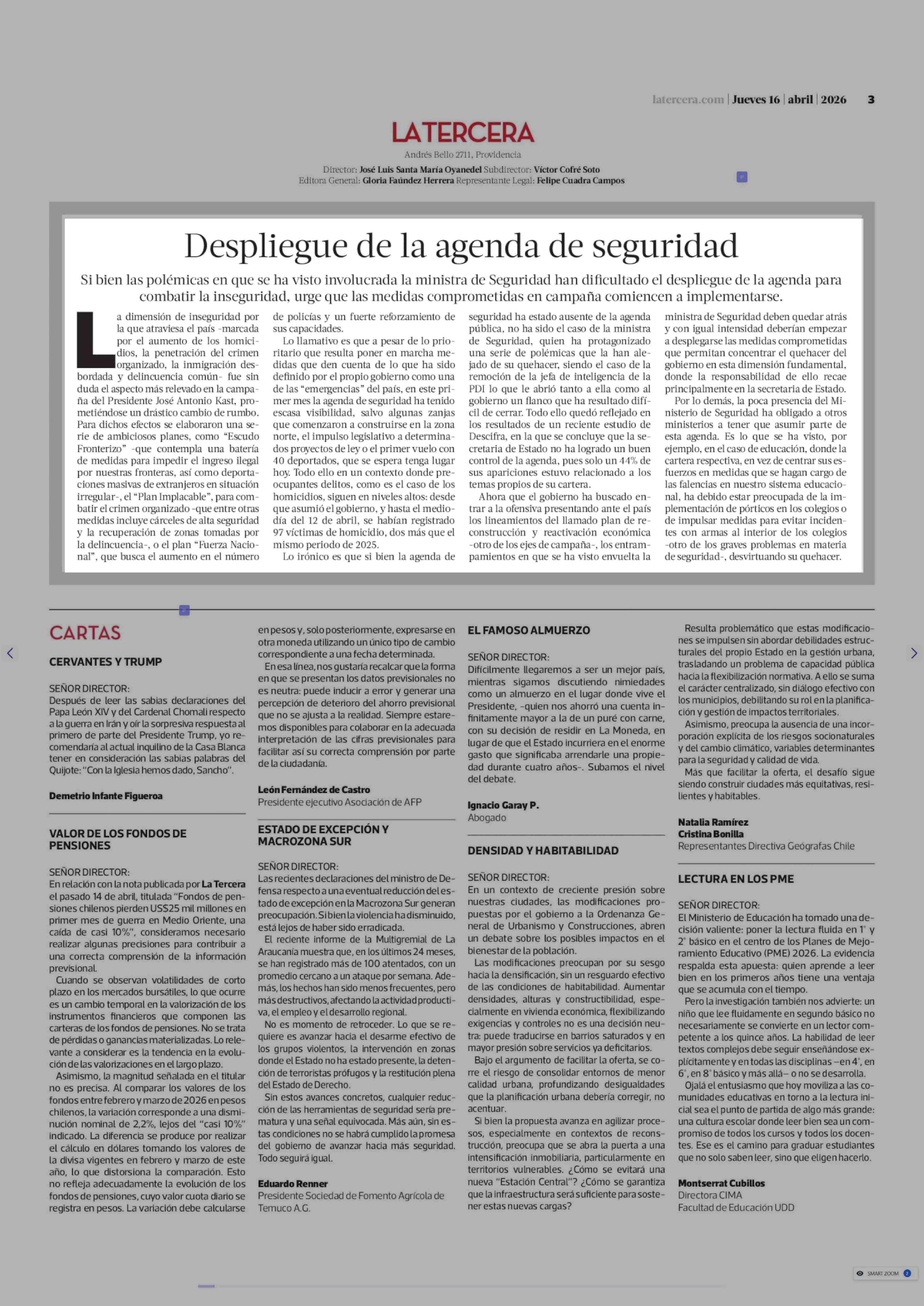 Editorial: Despliegue de la agenda de seguridad 16-04-2026 La Tercera |