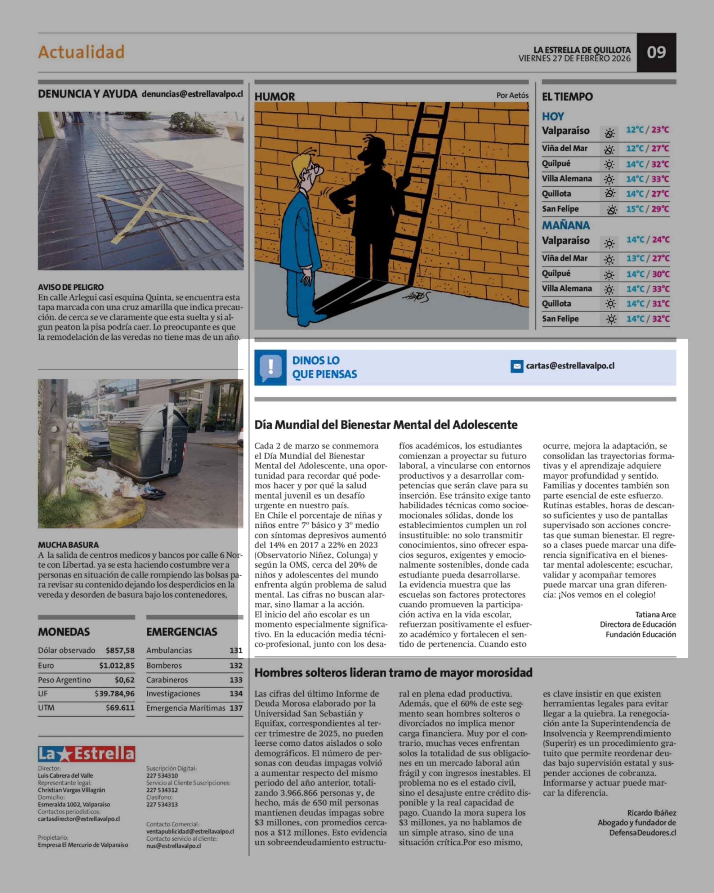 Cartas: Día Mundial del Bienestar Mental del Adolescente 27-02-2026 La Estrella de Quillota |