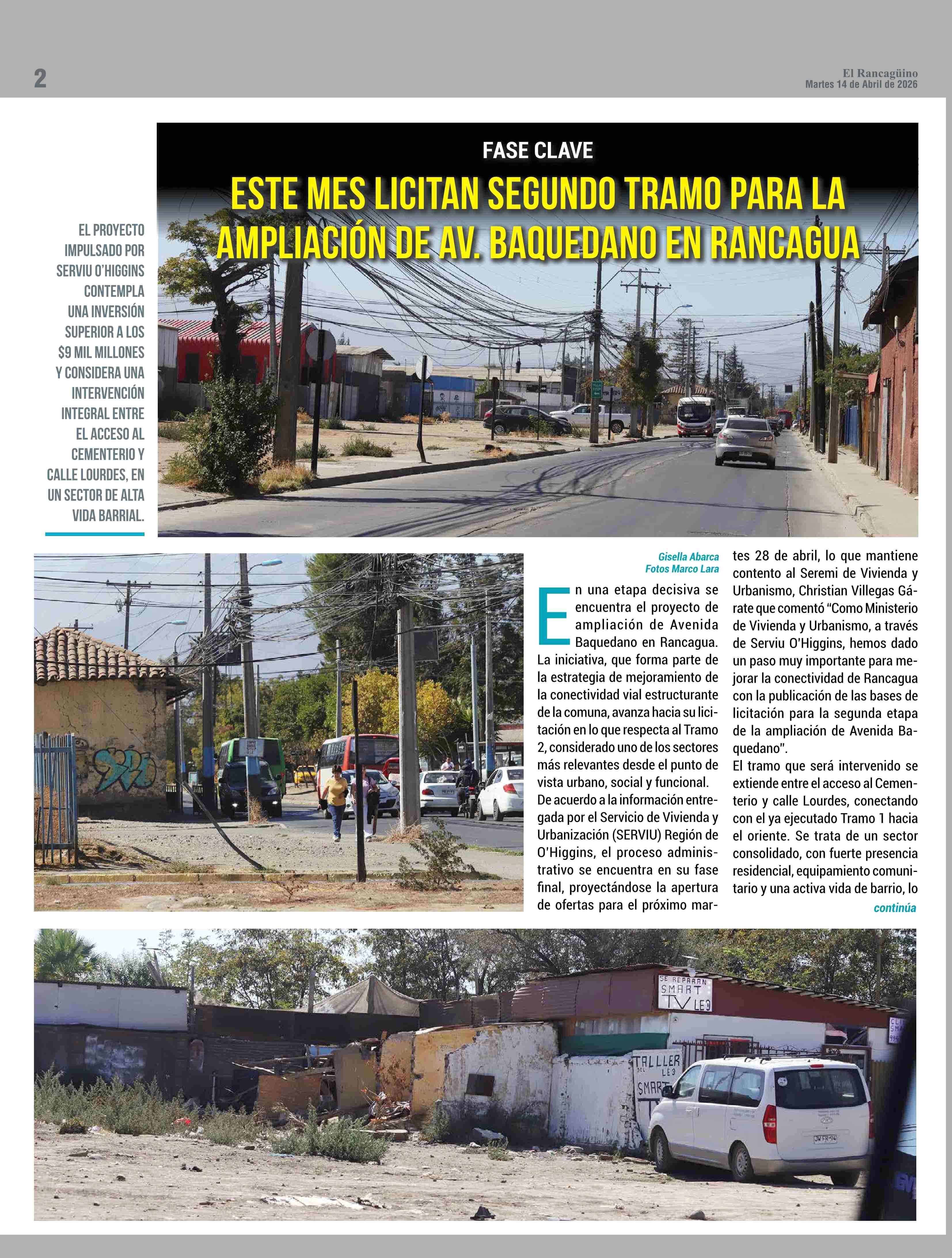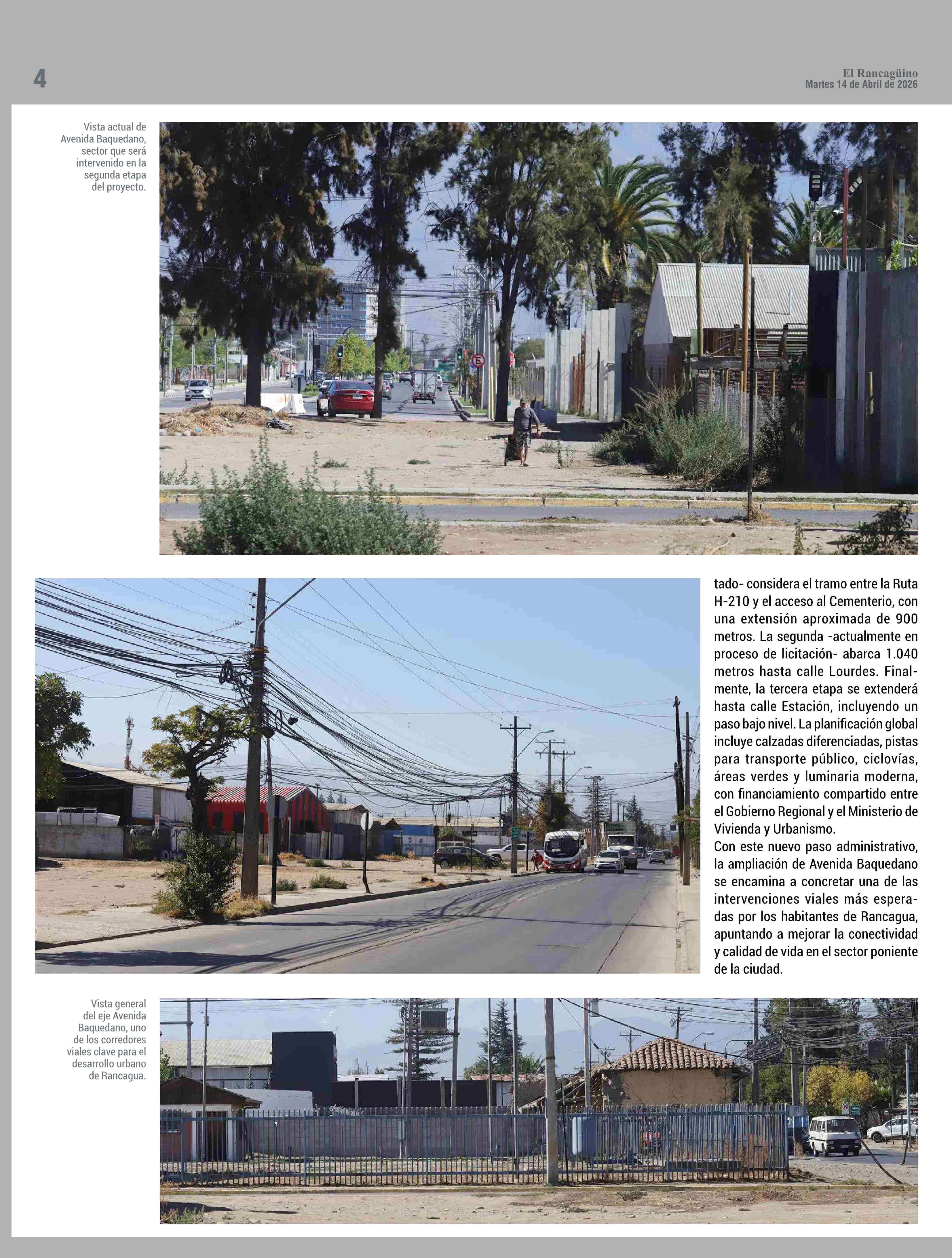 ESTE MES LICITAN SEGUNDO TRAMO PARA LA AMPLIACIÓN DE AV BAQUEDANO EN RANCAGUA 14-04-2026 El Rancagüino |