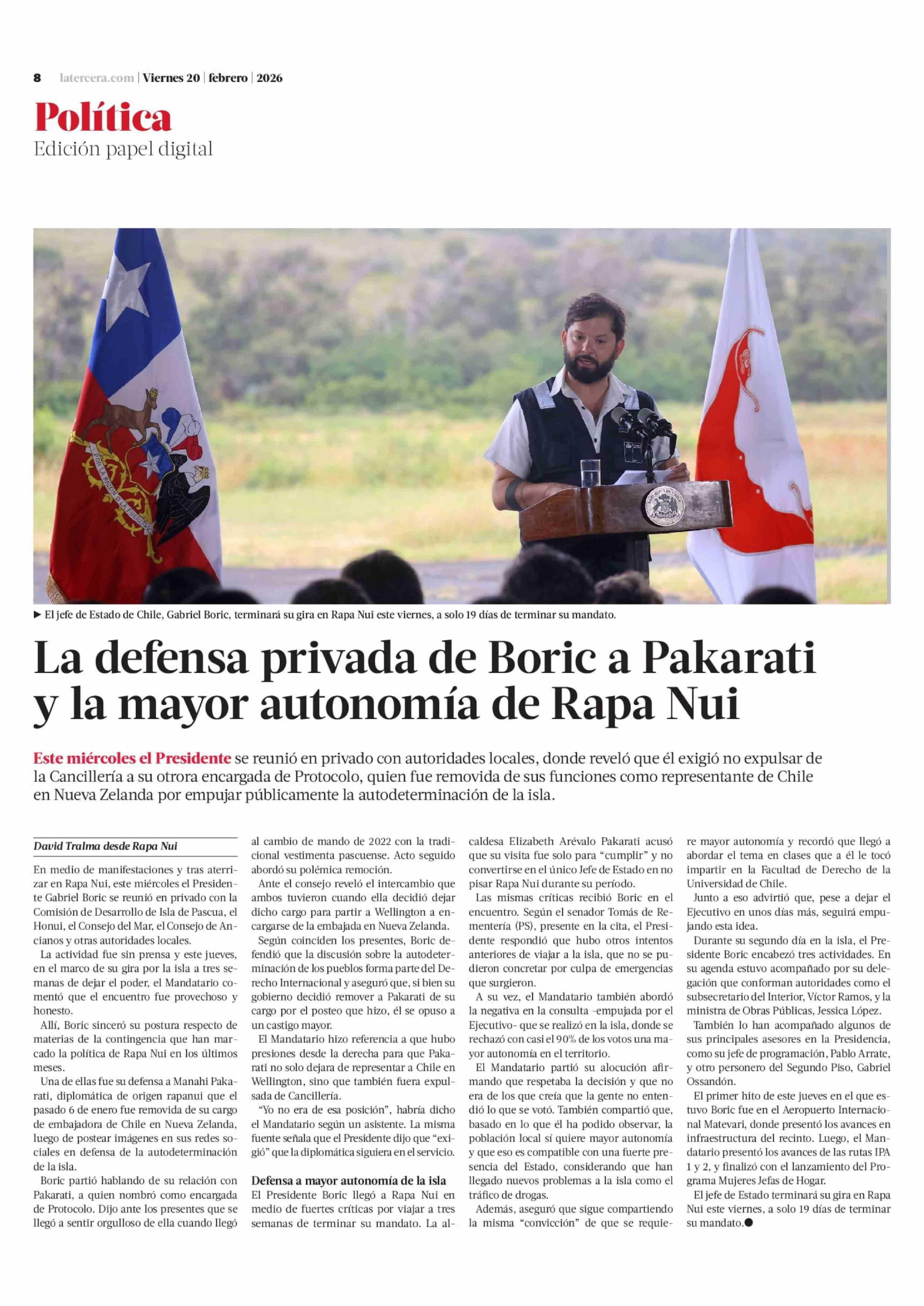 La defensa privada de Boric a Pakarati y la mayor autonomía de Rapa Nui 20-02-2026 La Tercera |