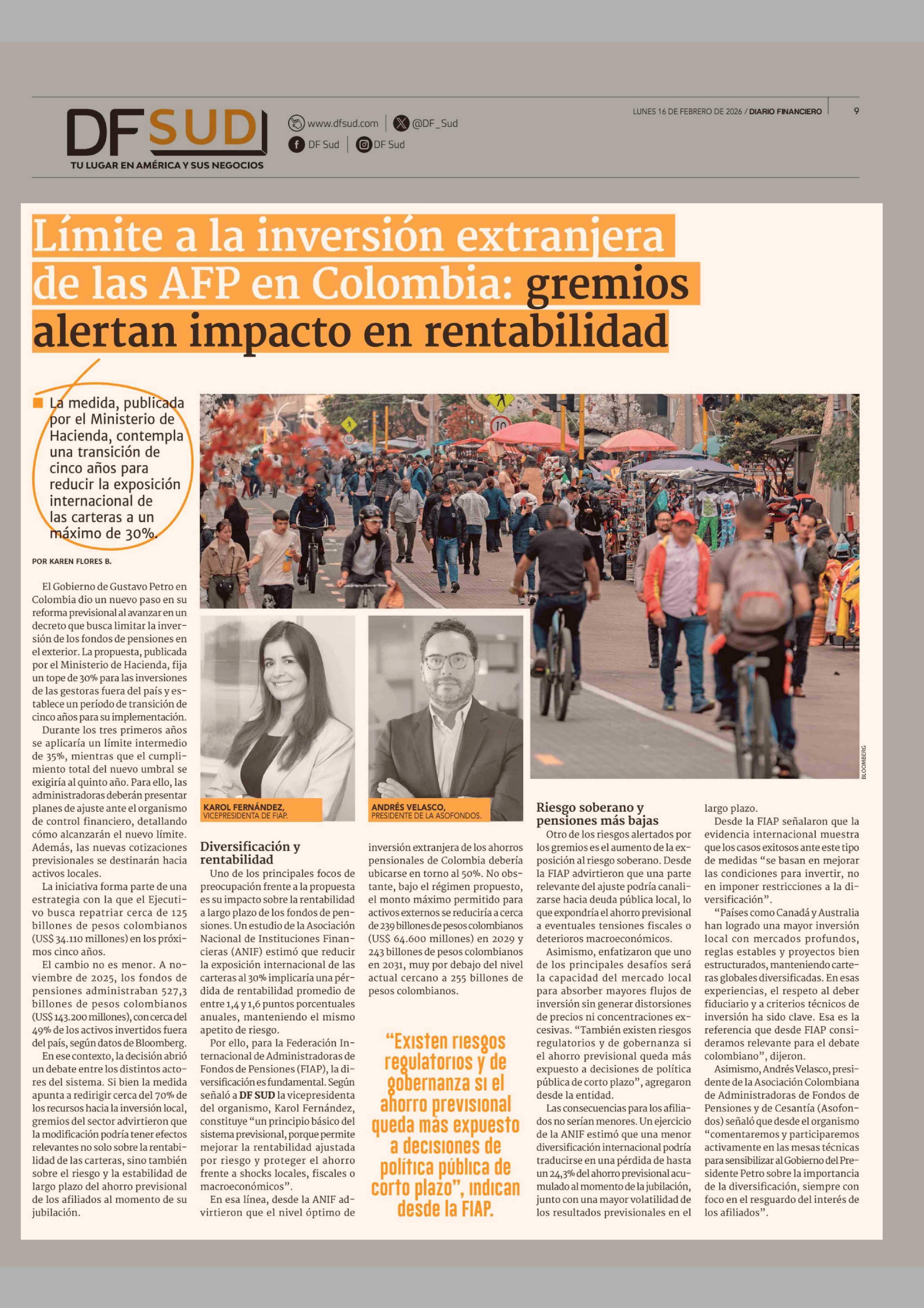Límite a la inversión extranjera de las AFP en Colombia: gremios alertan impacto en rentabilidad 16-02-2026 Diario Financiero |