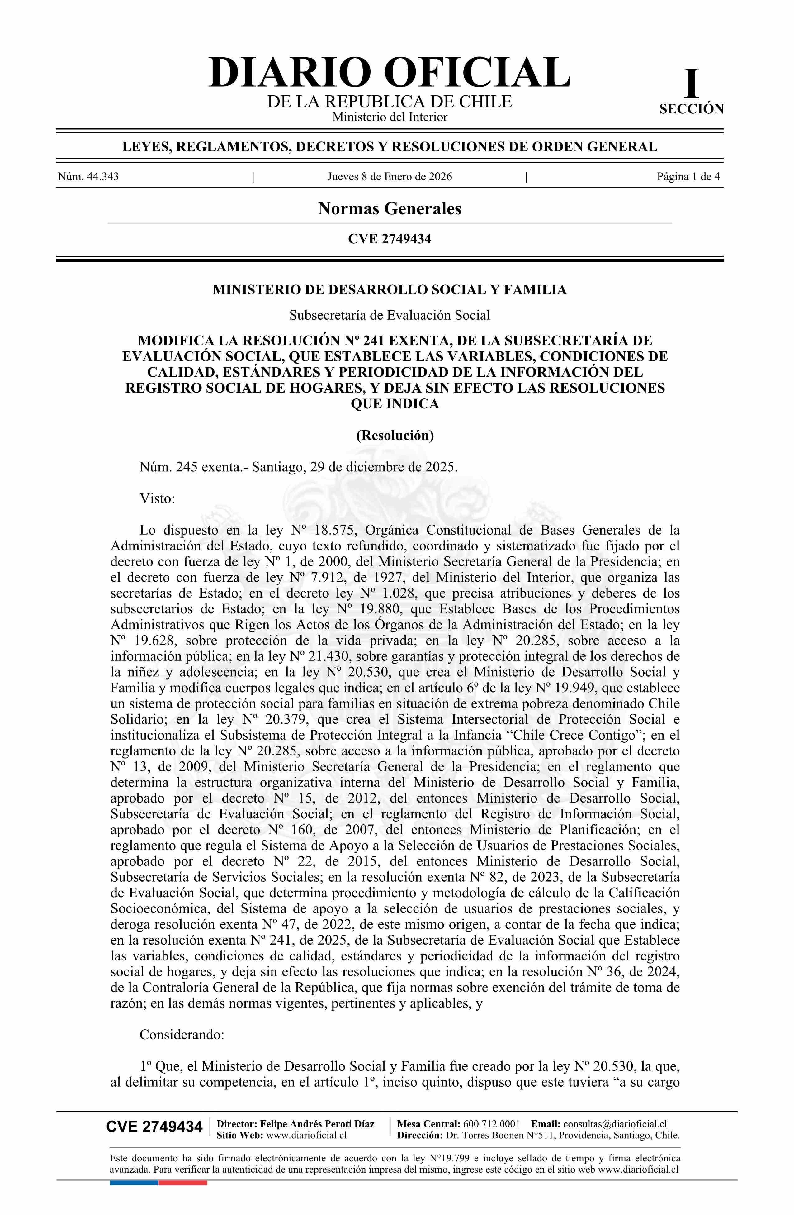 | Título: | Resolución exenta número 245, de 2025.- Modifica resolución Nº 241 exenta, que establece las variables, condiciones de calidad, estándares y periodicidad de la información del Registro Social de Hogares, y deja sin efecto resoluciones que indica |