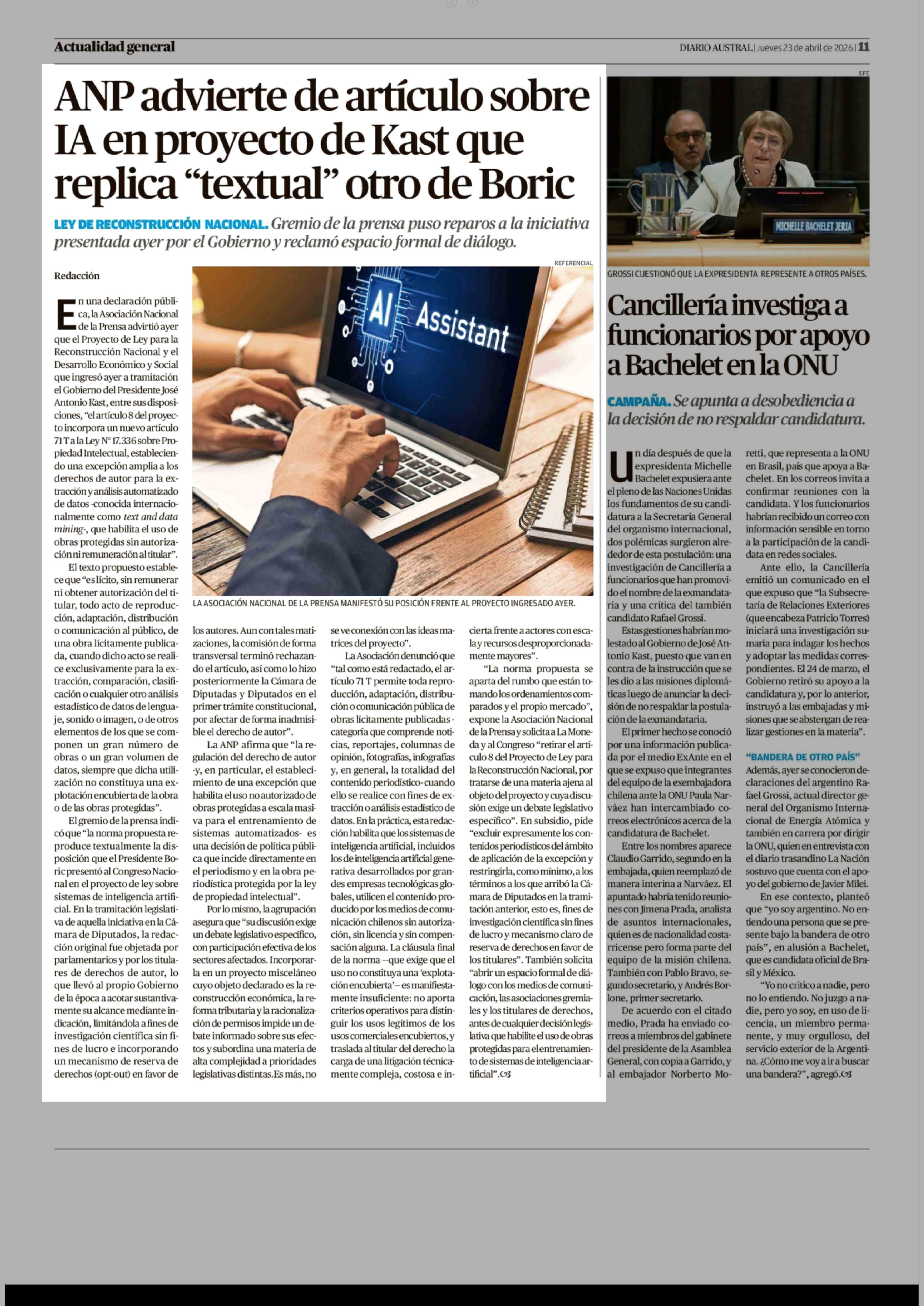ANP advierte de artículo sobre IA en proyecto de Kast que replica "textual" otro de Boric 23-04-2026 Diario Austral Región de Los Ríos |