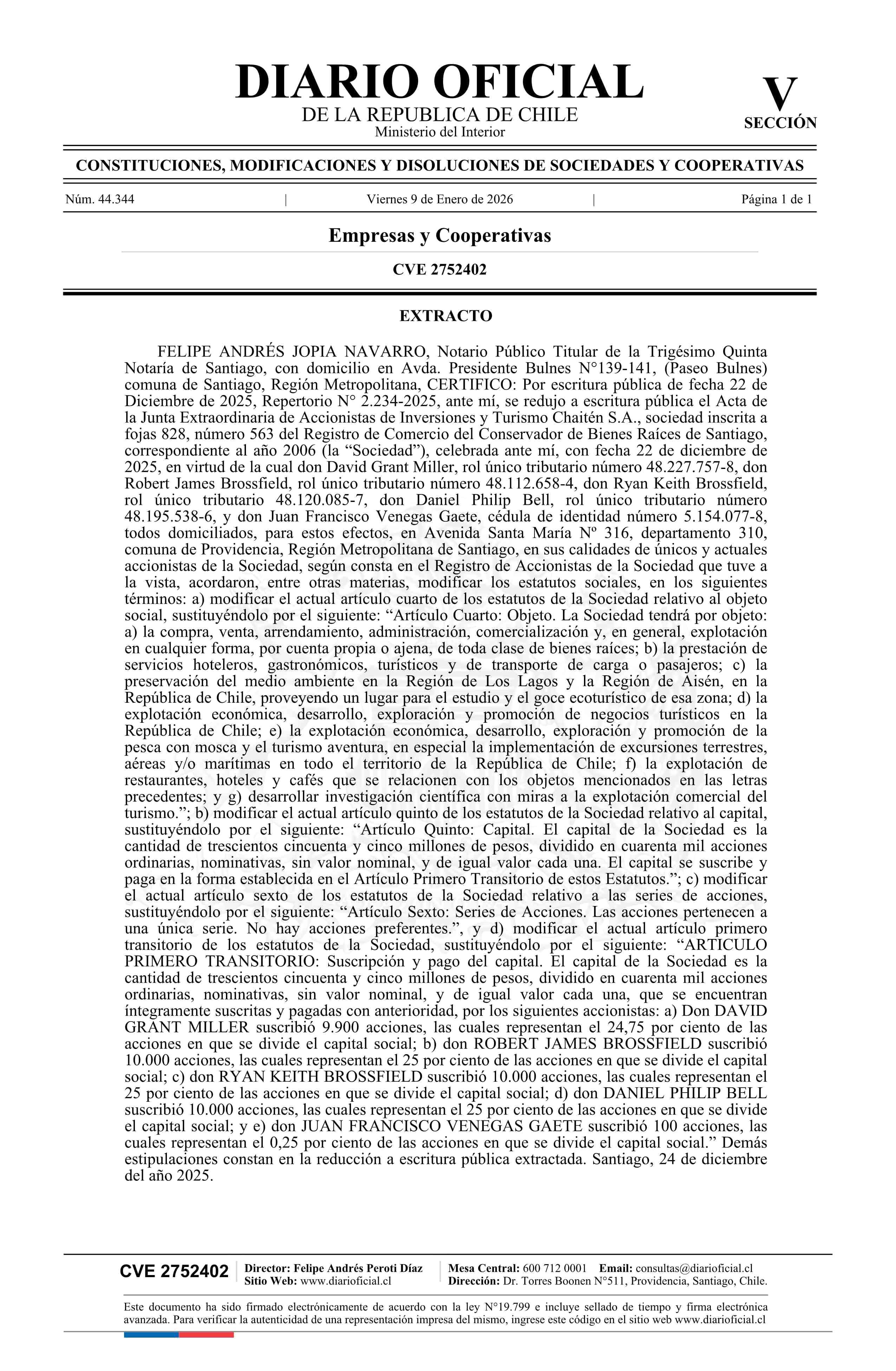 Inversiones y Turismo Chaitén S.A. 76.454.050-6 09-01-2026 Diario Oficial Edición Electrónica |