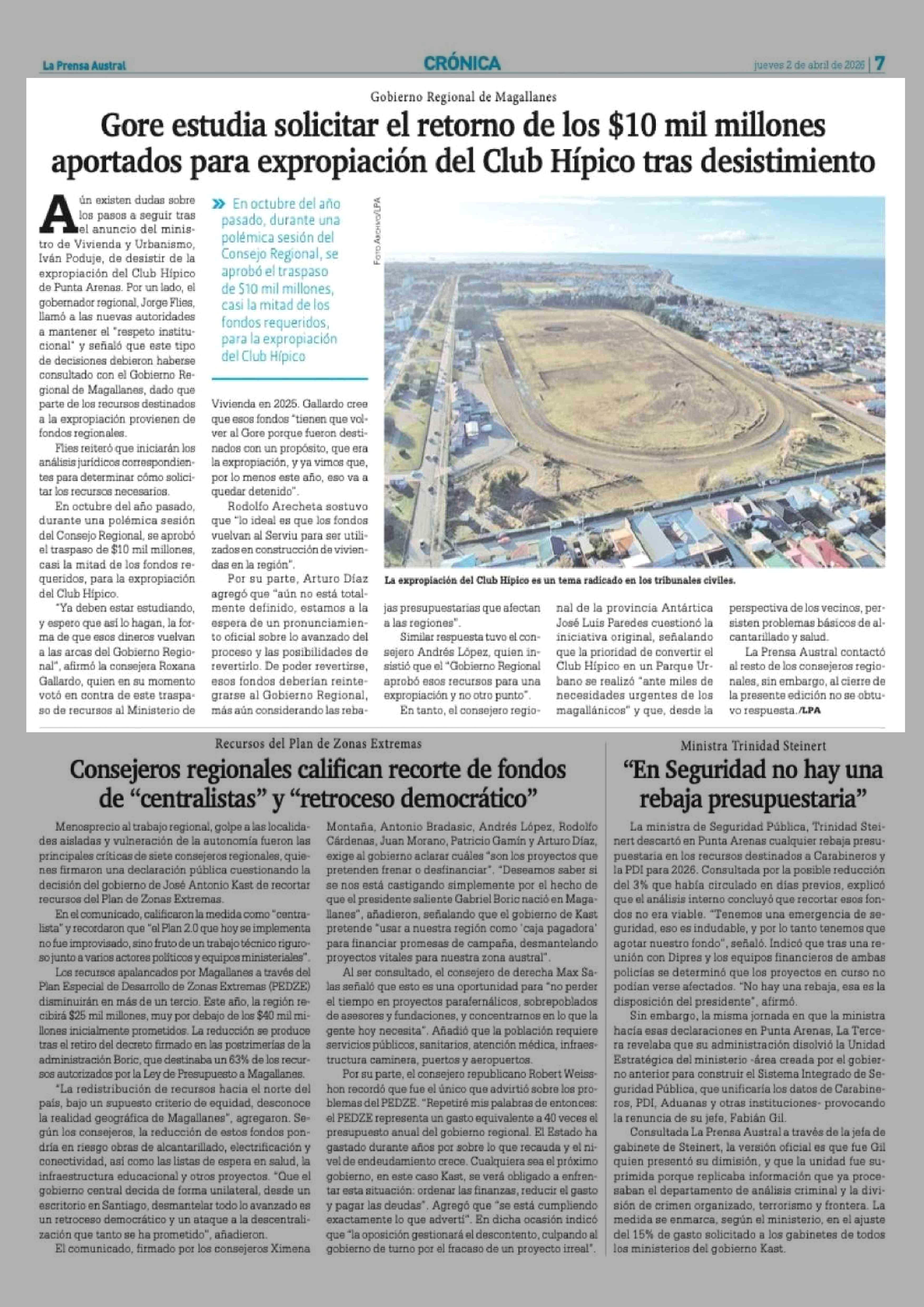 Gore estudia solicitar el retorno de los $10 mil millones aportados para expropiación del Club Hípico tras desistimiento 02-04-2026 La Prensa Austral |