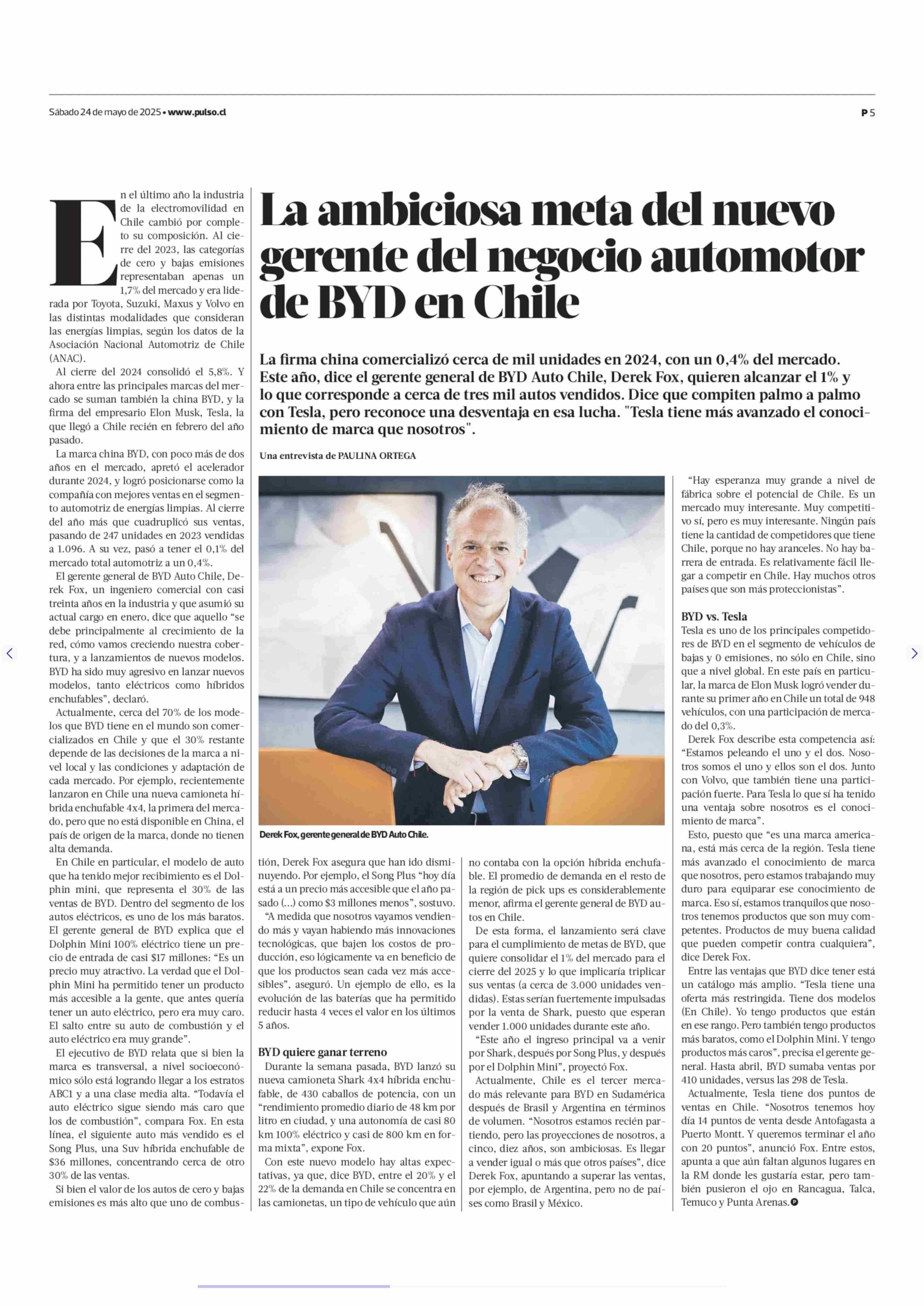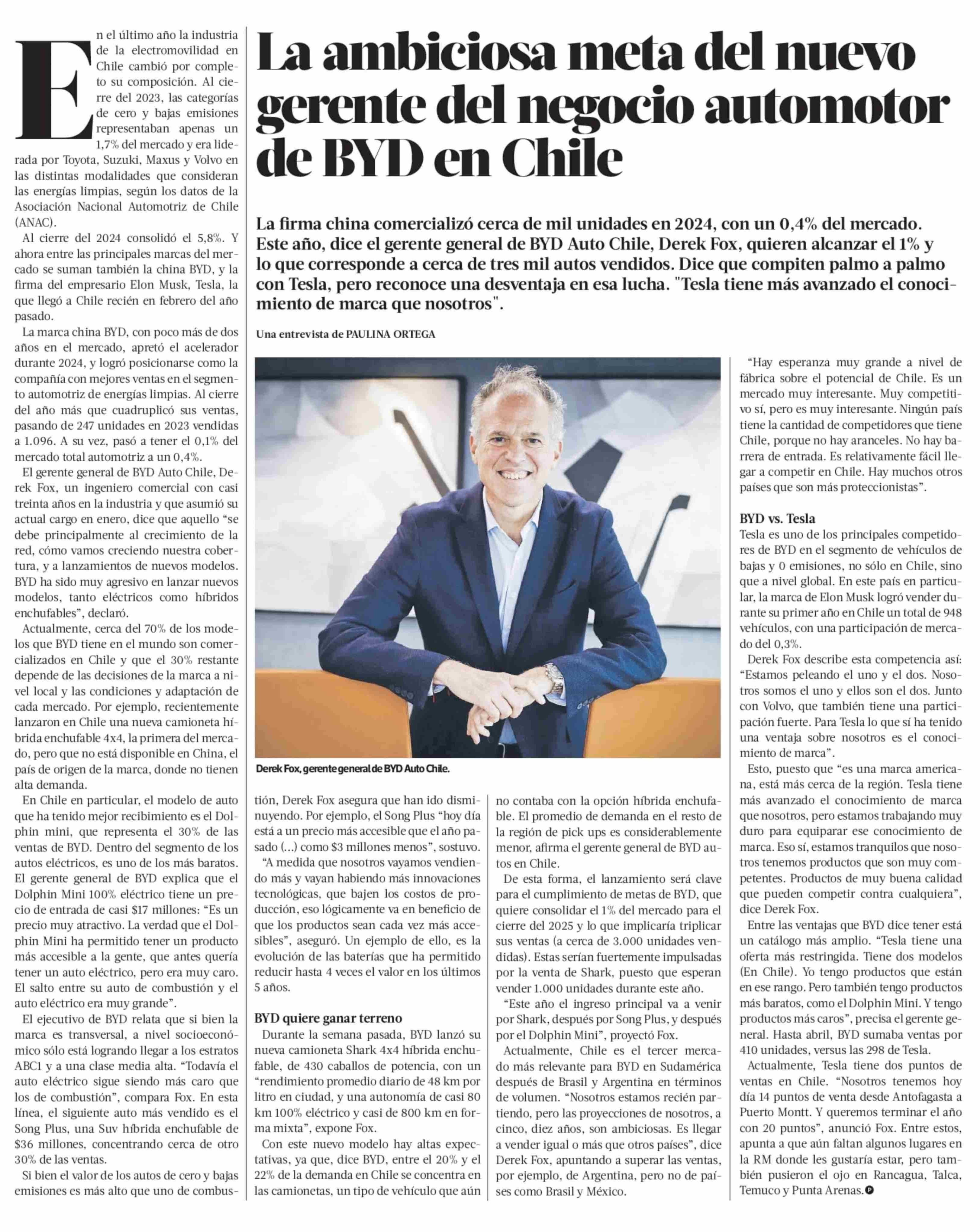 La ambiciosa meta del nuevo gerente del negocio automotor de BYD en Chile 24-05-2025 La Tercera |
