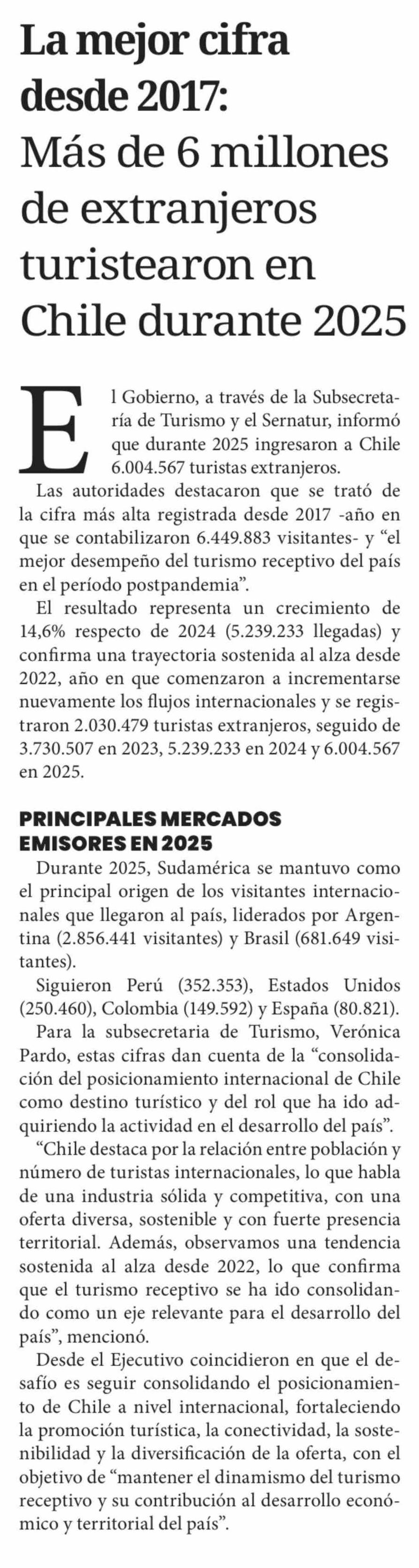 La mejor cifra desde 2017: Más de 6 millones de extranjeros turistearon en Chile durante 2025 20-02-2026 Diario Chañarcillo |