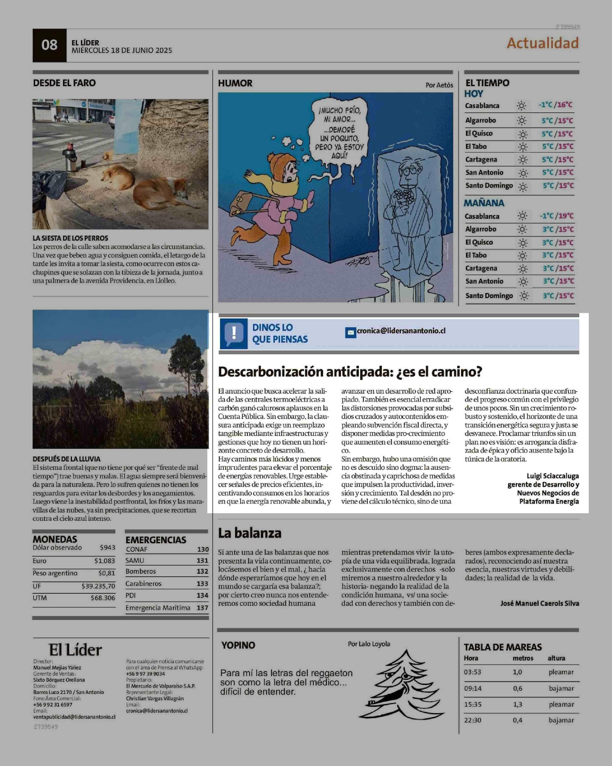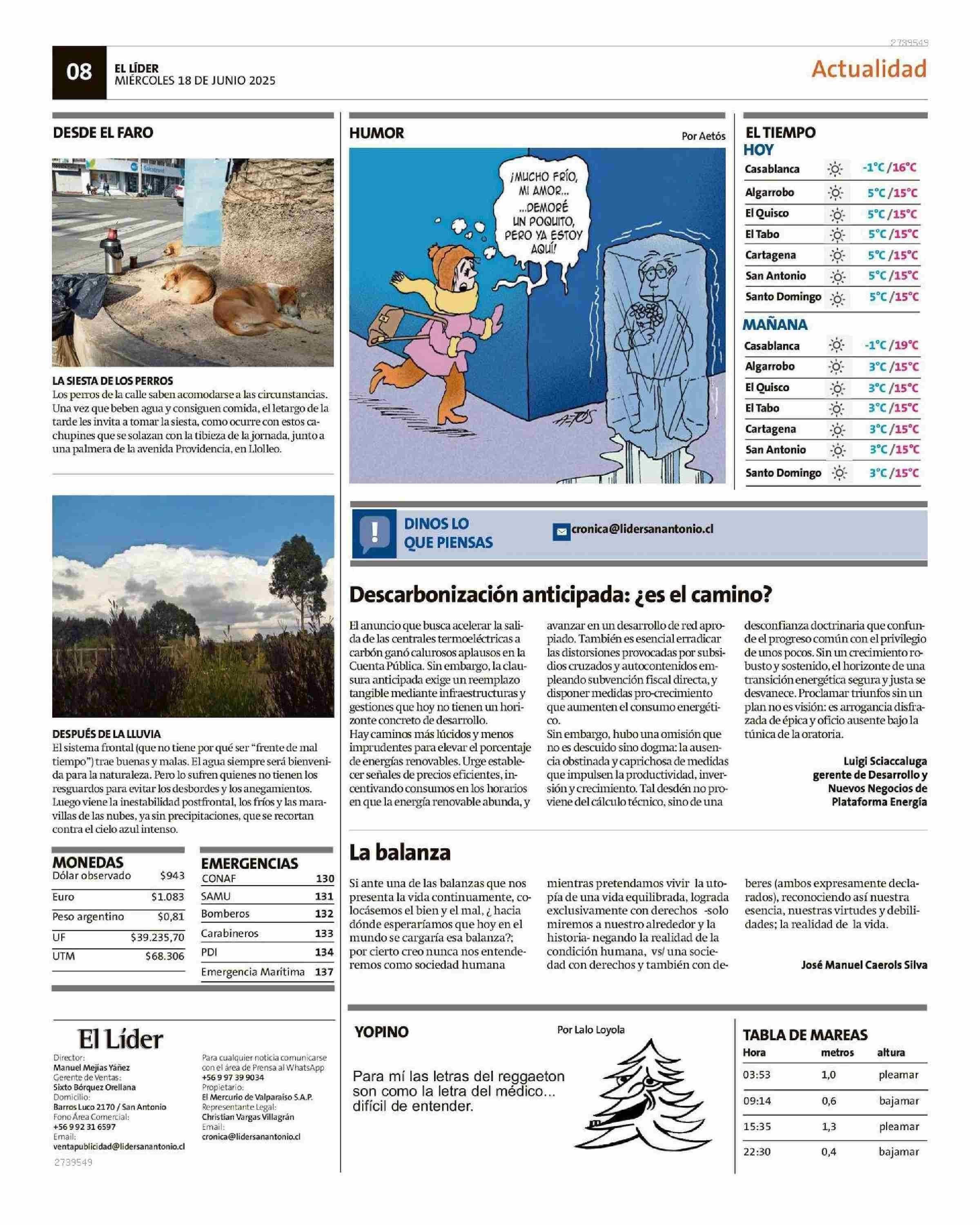 Cartas: Descarbonización anticipada: ¿ es el camino? 18-06-2025 El Líder |