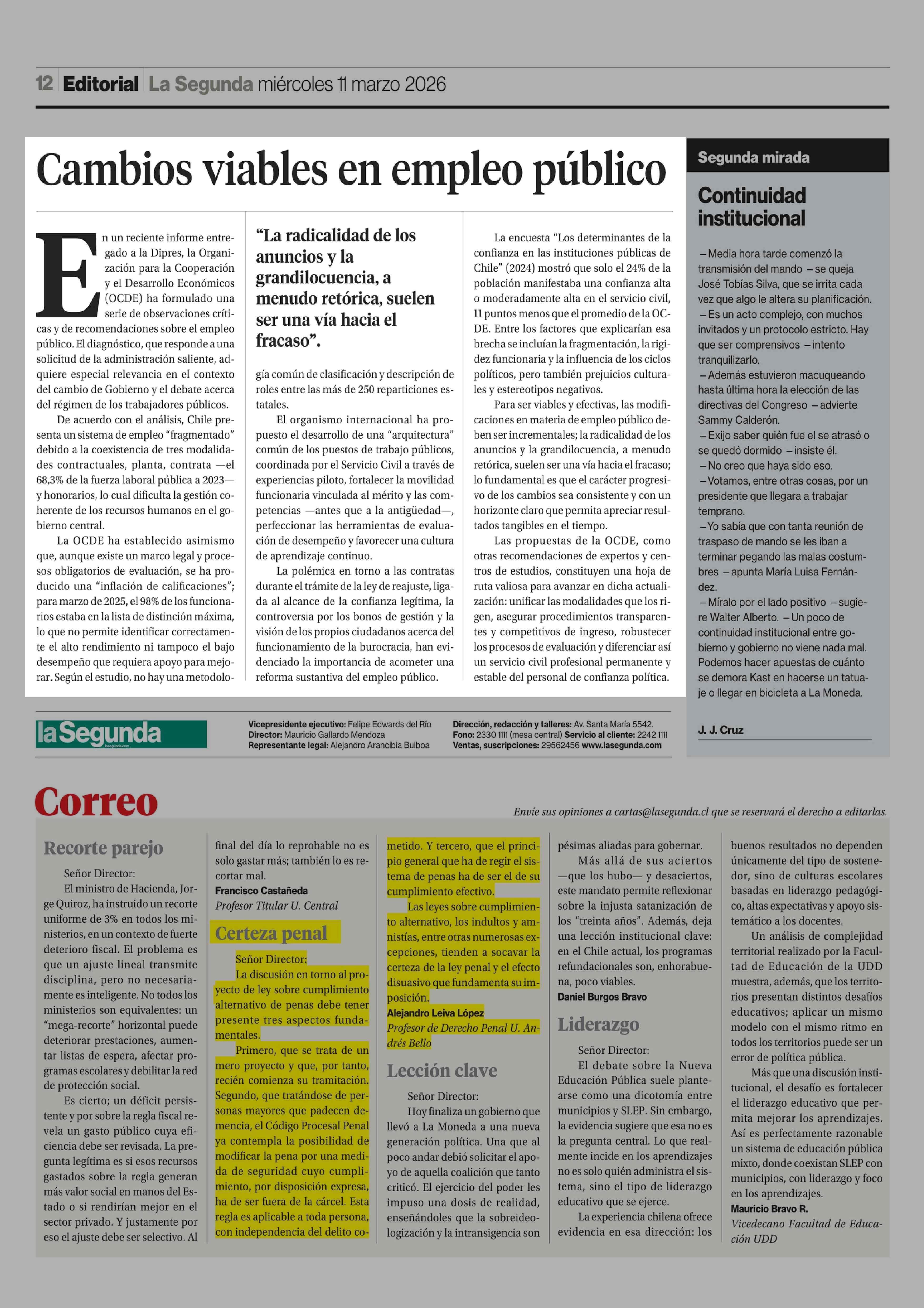 Editorial: Cambios viables en empleo público 11-03-2026 La Segunda |