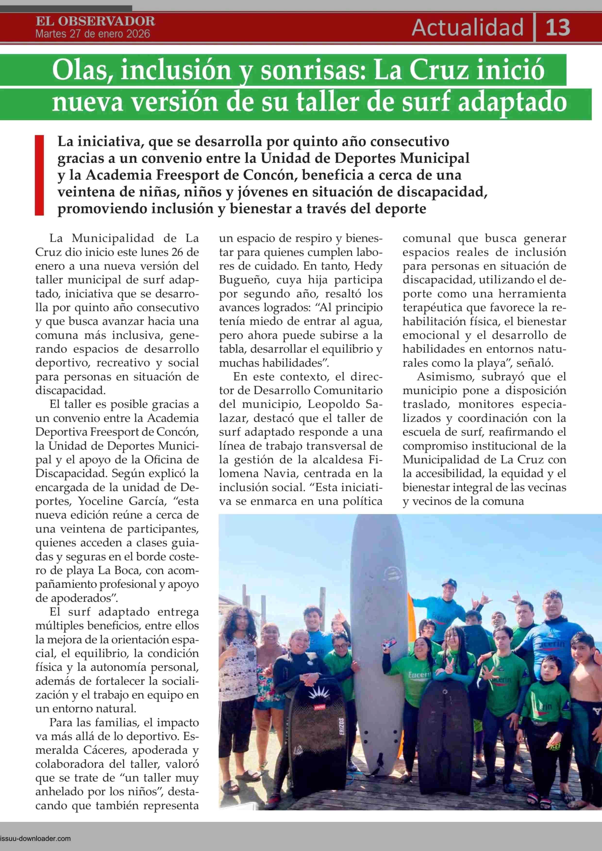 Olas, inclusión y sonrisas: La Cruz inició e nueva versión de su taller de surf adaptado 27-01-2026 El Observador Vespertino |