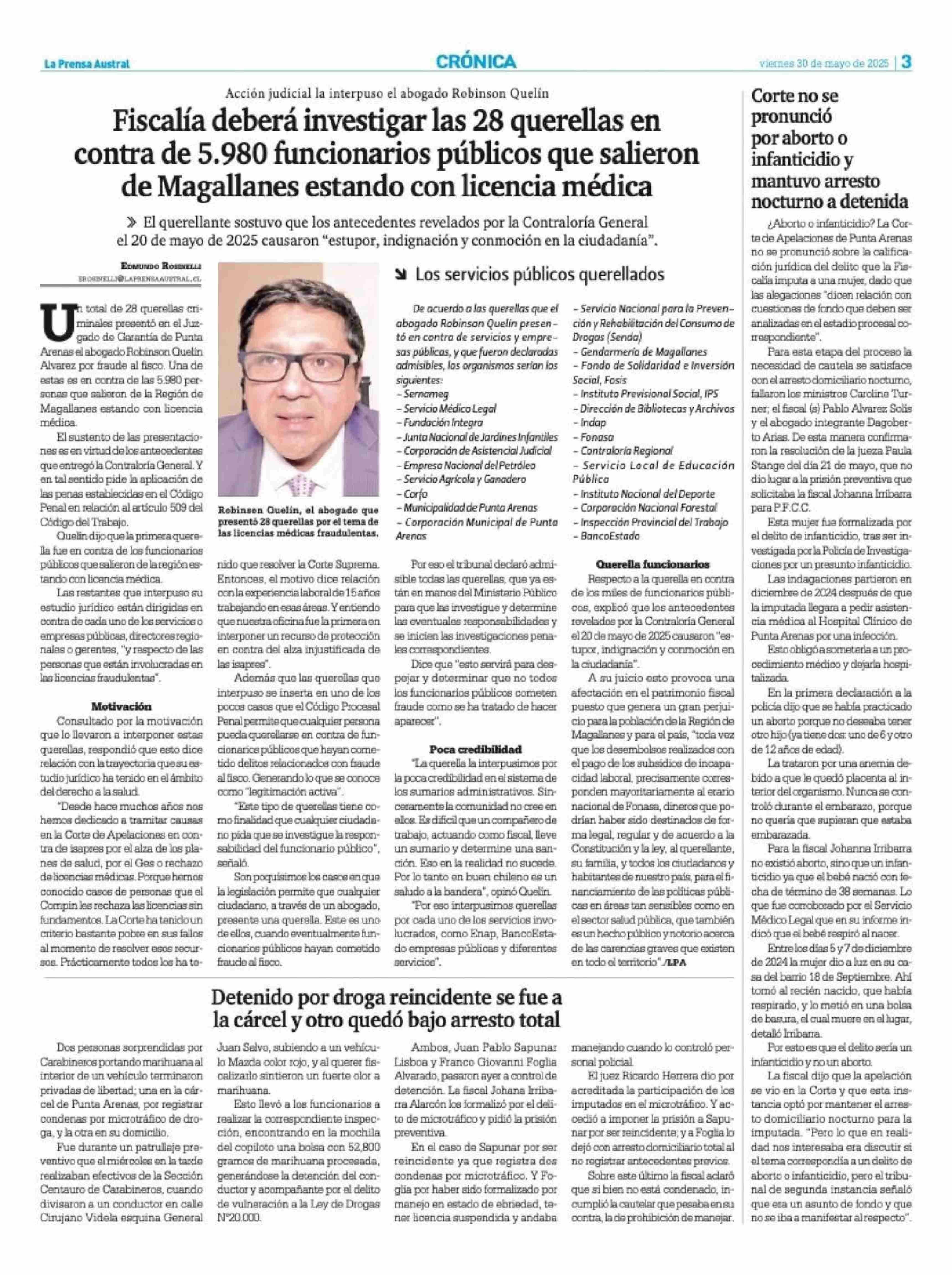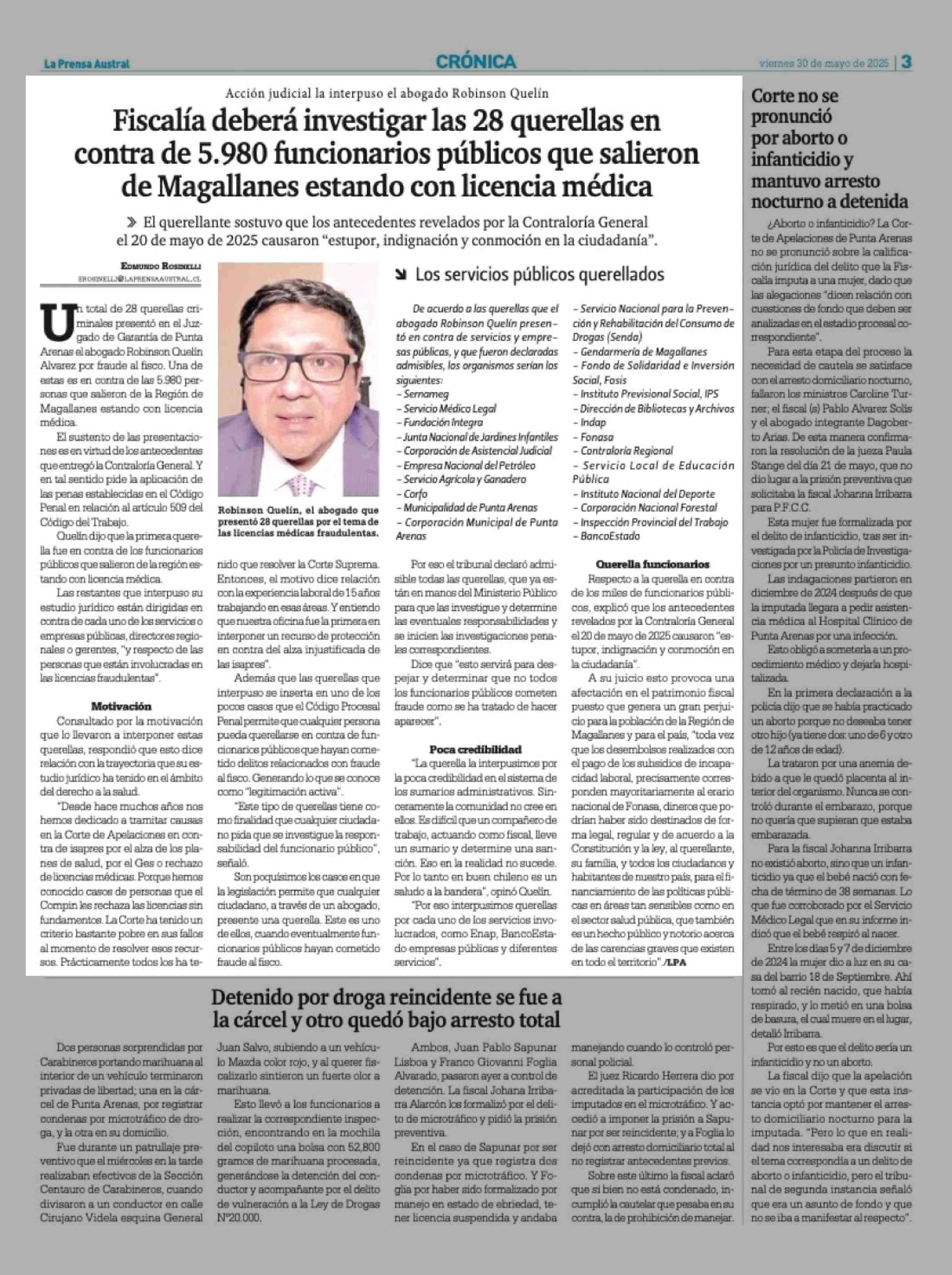 Fiscalía deberá investigar las 28 querellas en contra de 5.980 funcionarios públicos que salieron de Magallanes estando con licencia médica 30-05-2025 La Prensa Austral |