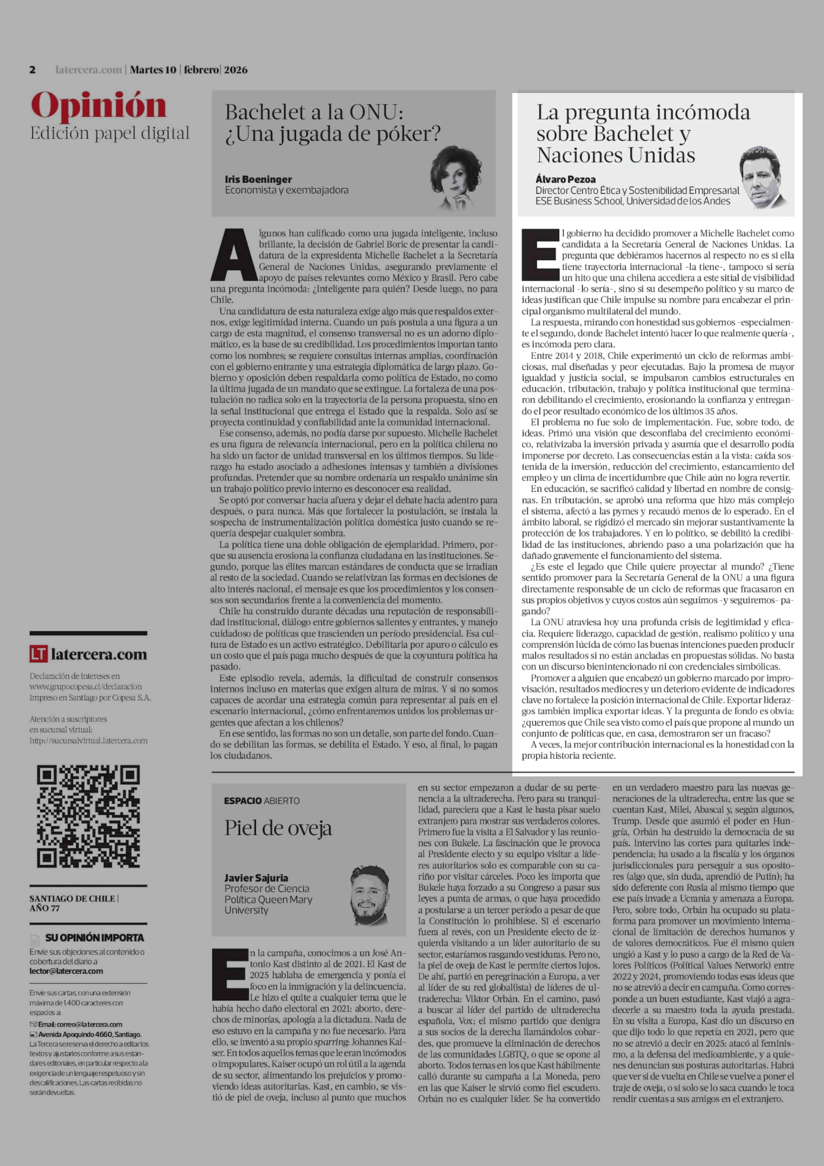 Columnas de Opinión: La pregunta incómoda sobre Bachelet y Naciones Unidas 10-02-2026 La Tercera |