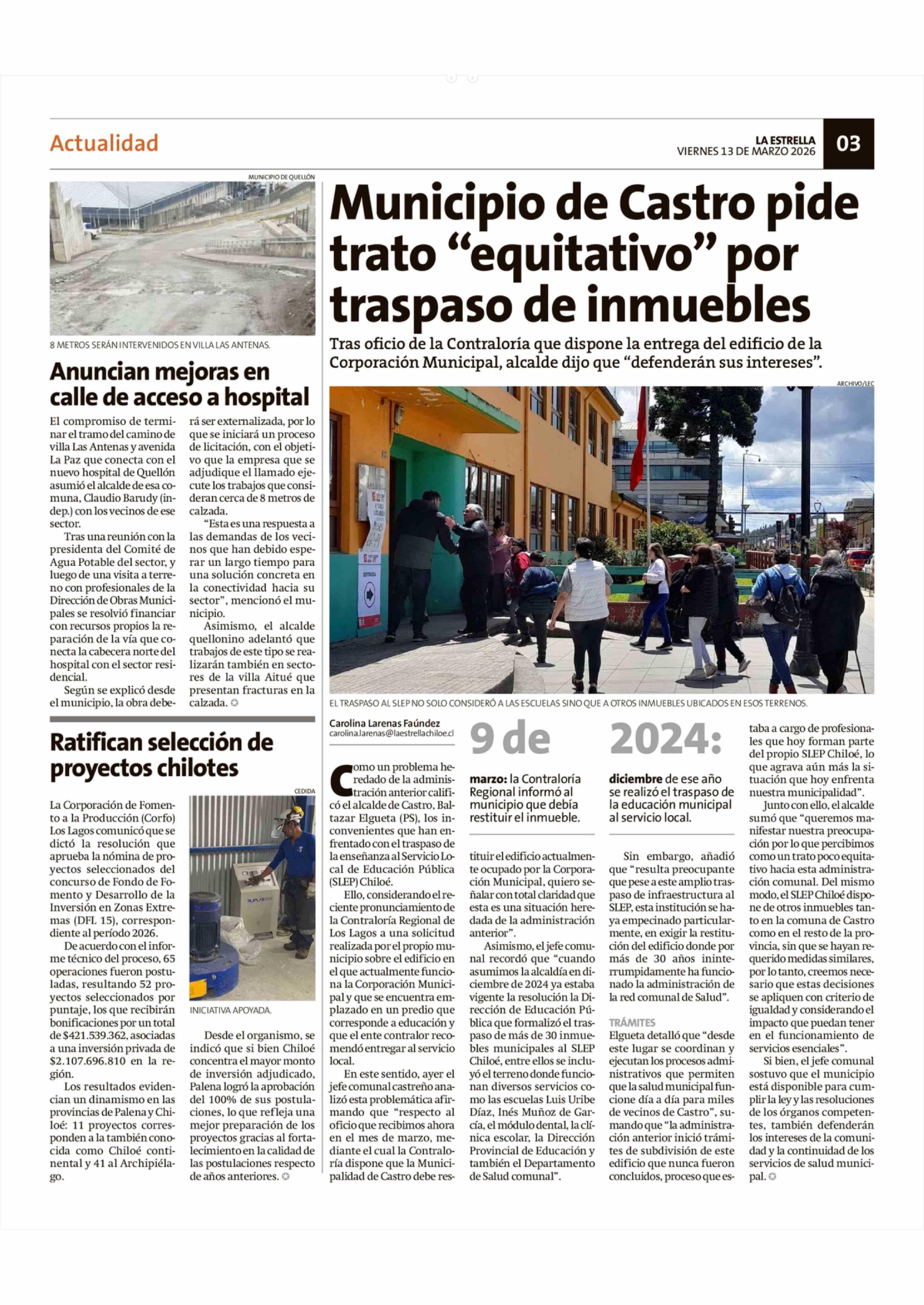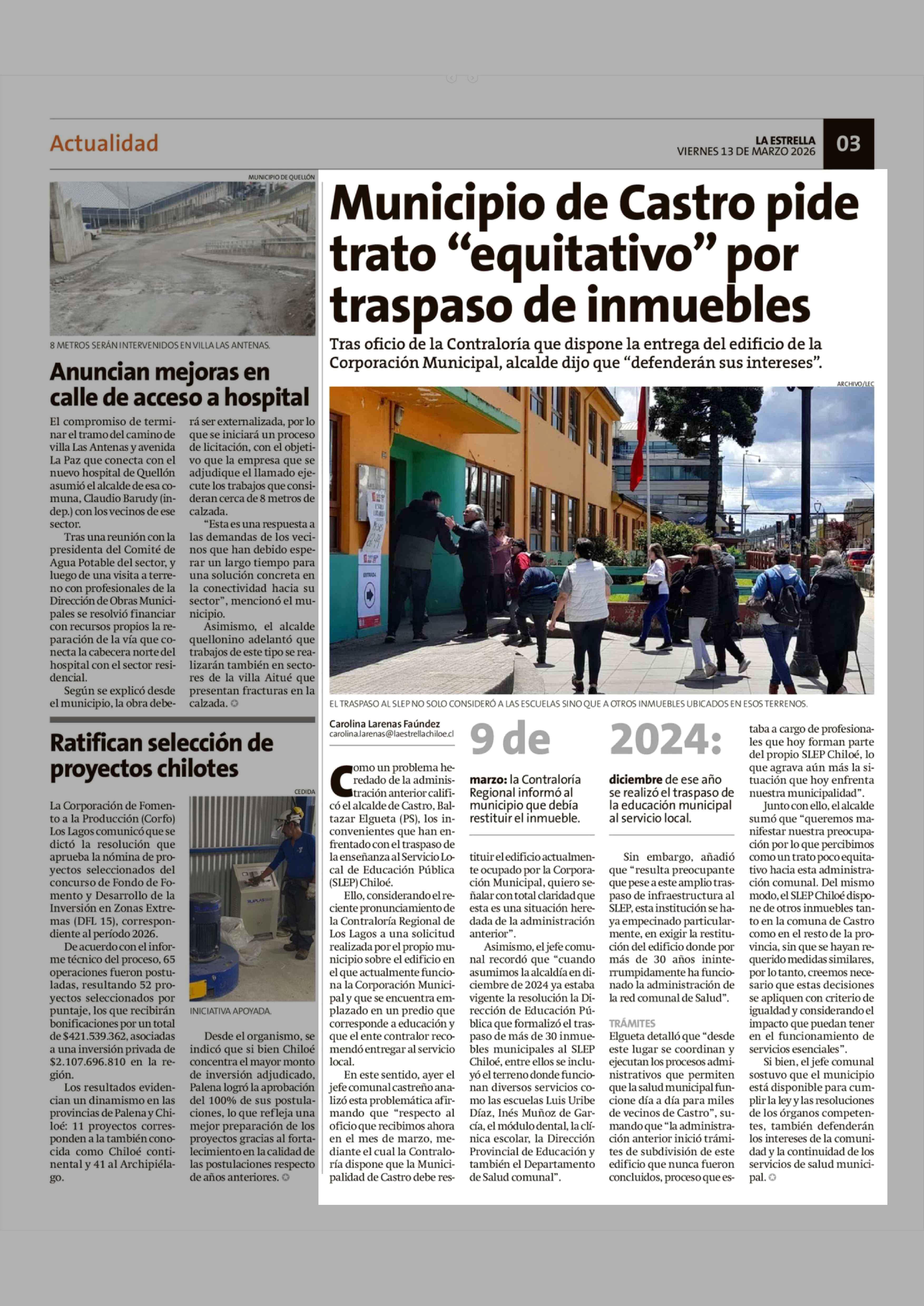 Municipio de Castro pide trato "equitativo" por traspaso de inmuebles 13-03-2026 La Estrella de Chiloé |