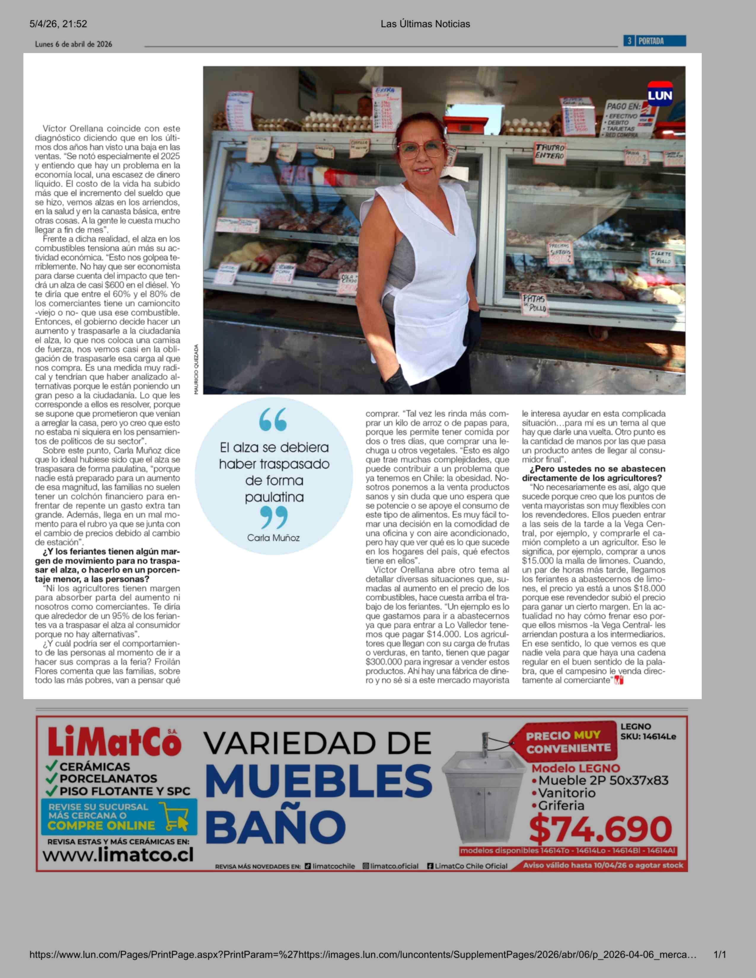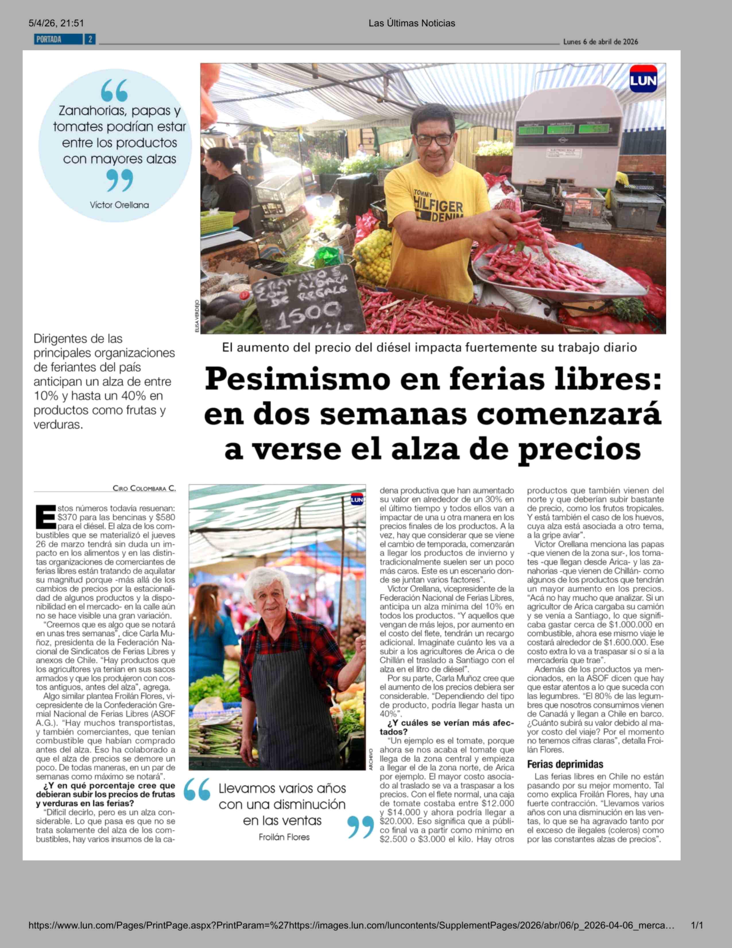 Pesimismo en ferias libres: en dos semanas comenzará a verse el alza de precios 06-04-2026 Las Últimas Noticias |