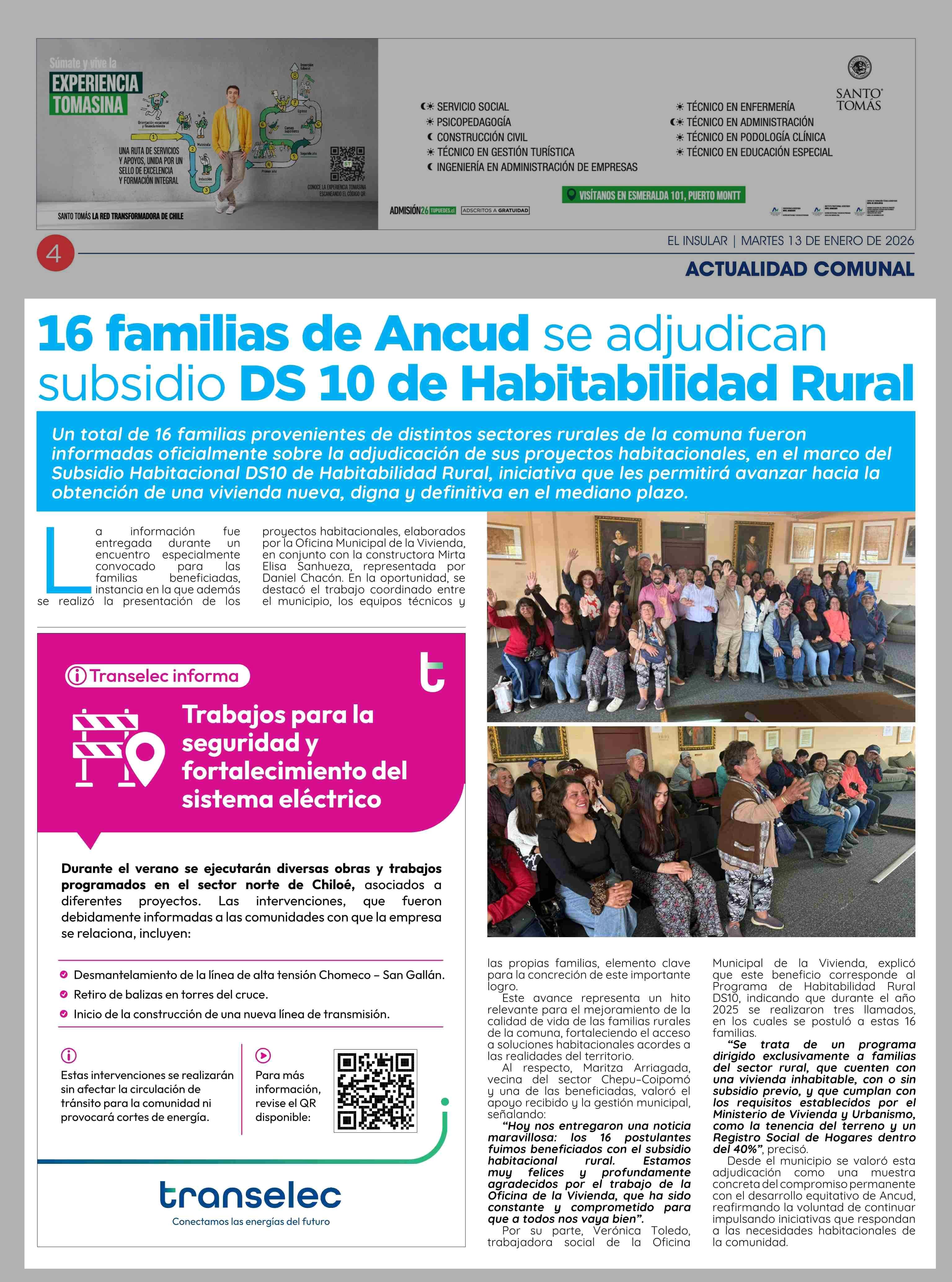 16 Familias de Ancud se adjudican subsidio DS 10 de Habitabilidad Rural 13-01-2026 El Insular |