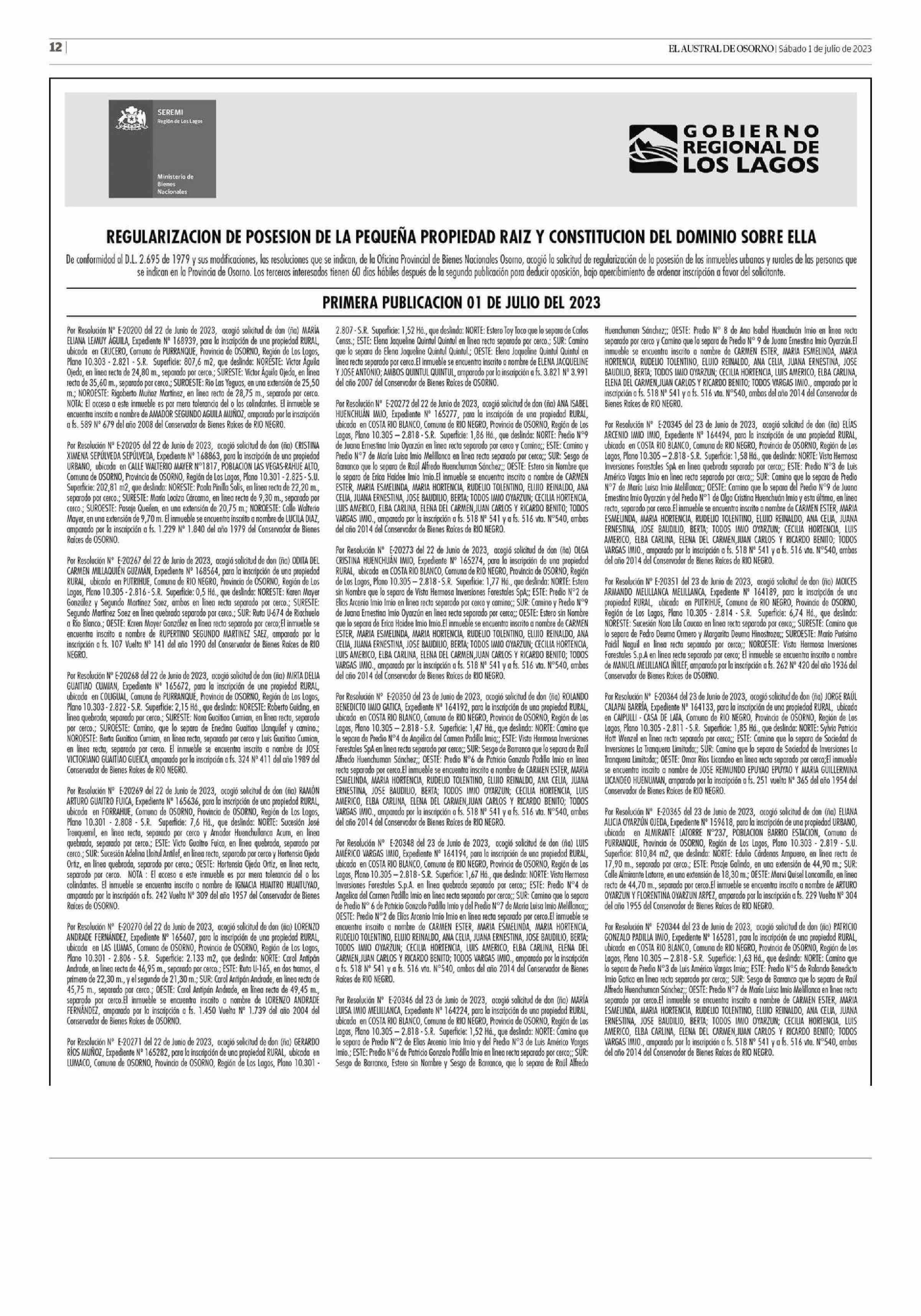 REGULARIZACION DE POSESION DE LA PEQUEÑA PROPIEDAD RAIZ Y CONSTITUCION DEL DOMINIO SOBRE ELLA 01-07-2023 El Austral de Osorno |